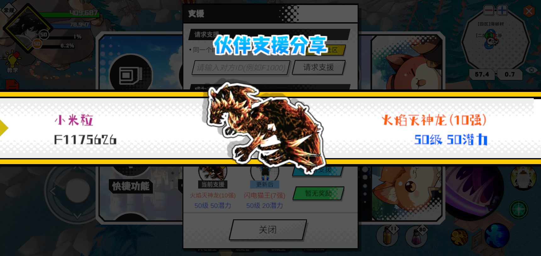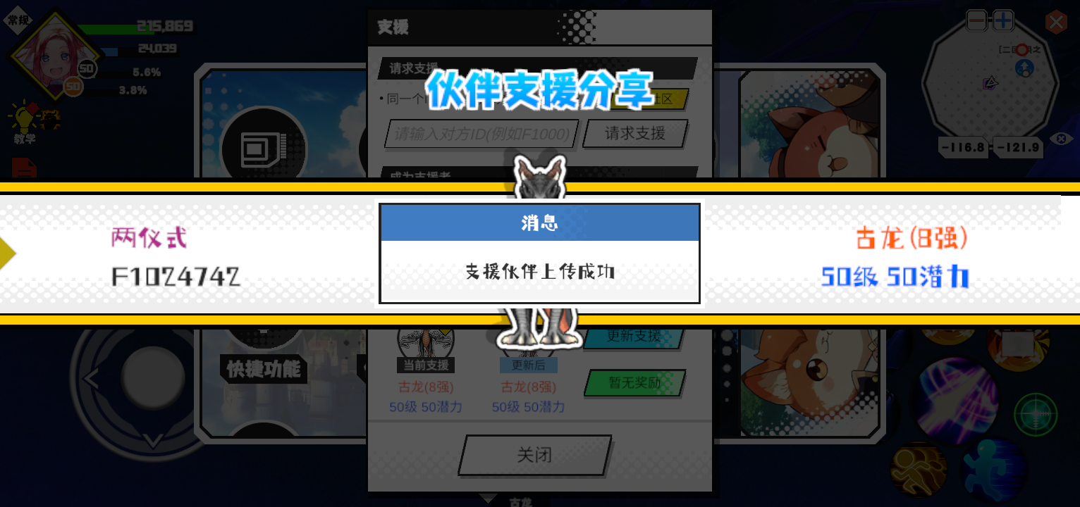 支援者:一念执着(F1099111)如果遇到困难,可以召唤我的宠物帮忙,召唤方法是进入地图后点击左下角的手机功能>支援>输入【F1099111】>就可以召唤我的宠物!我的宠物是蛋壳王(9强)50级 50潜力技能1:黑魔破技能2:黑魔破技能3:黑魔破技能4:黑魔破智慧配点:245初阶职业:鬼咒进阶职业:海神#超数据世界