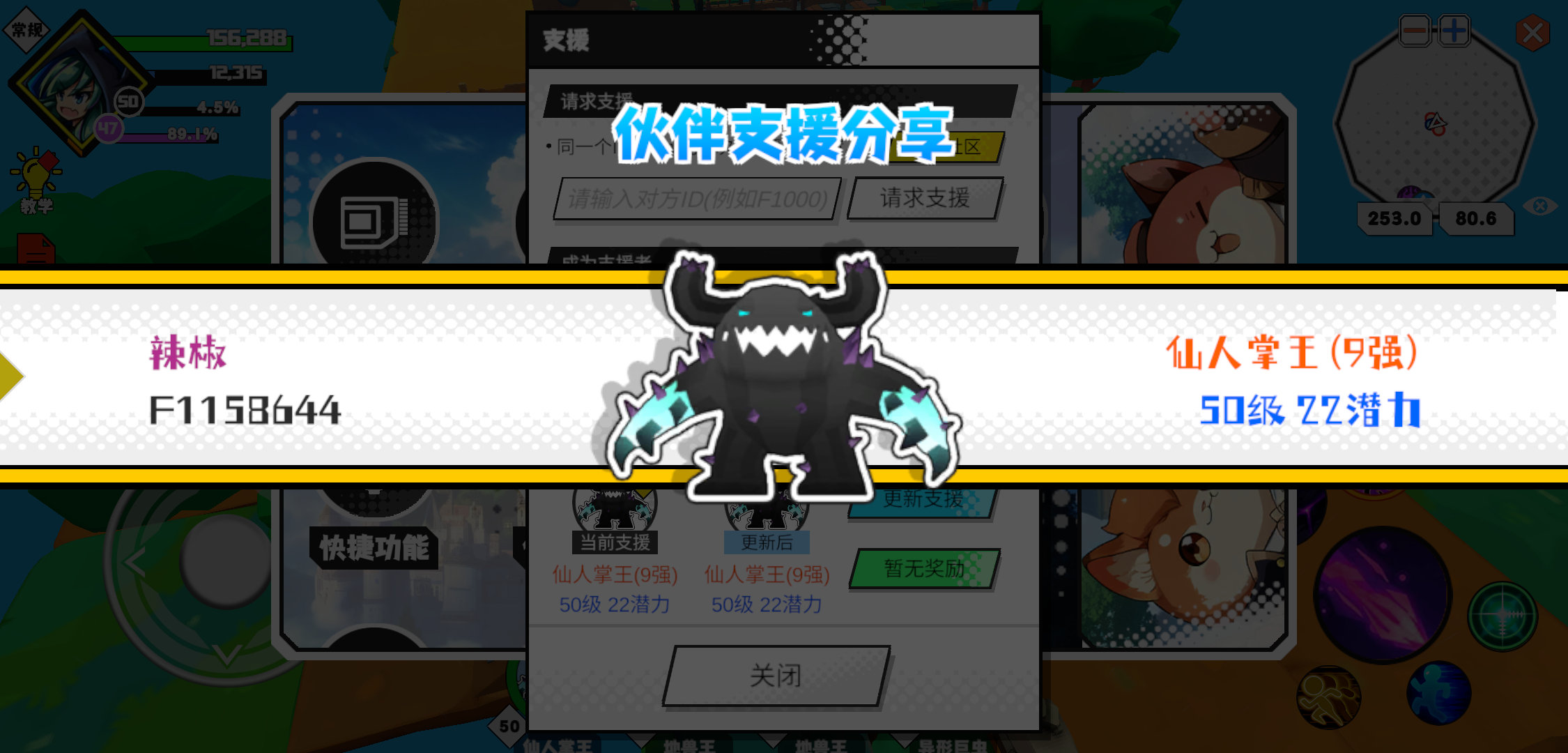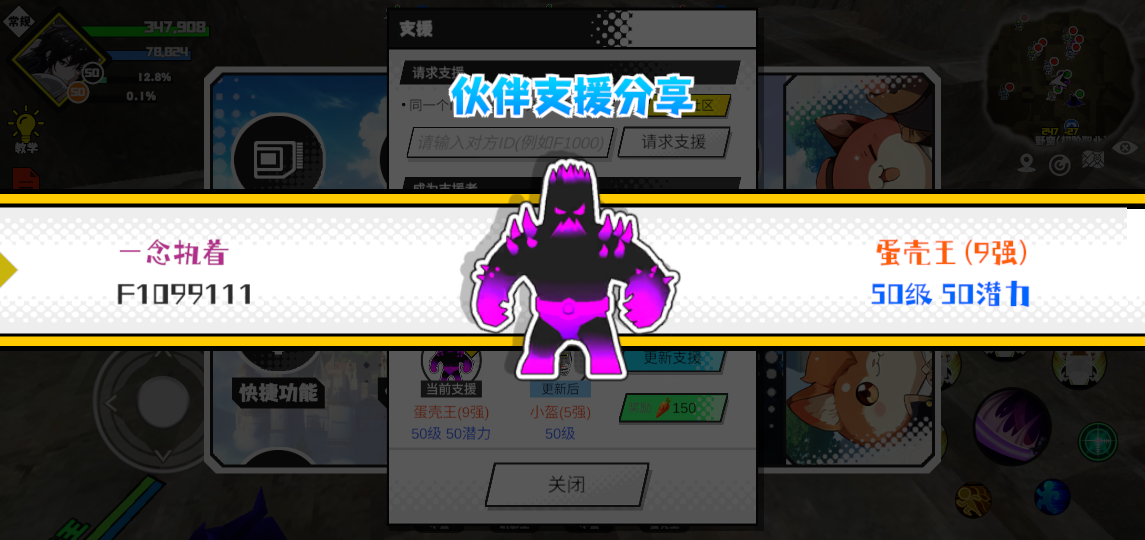 #超数据世界 支援者:铭(F1175439)如果遇到困难,可以召唤我的宠物帮忙,召唤方法是进入地图后点击左下角的手机功能>支援>输入【F1175439】>就可以召唤我的宠物!我的宠物是蛋壳王(9强)50级 50潜力技能1:黑魔破技能2:黑魔破技能3:黑魔破技能4:黑魔破智慧配点:245初阶职业:魔导进阶职业:海神