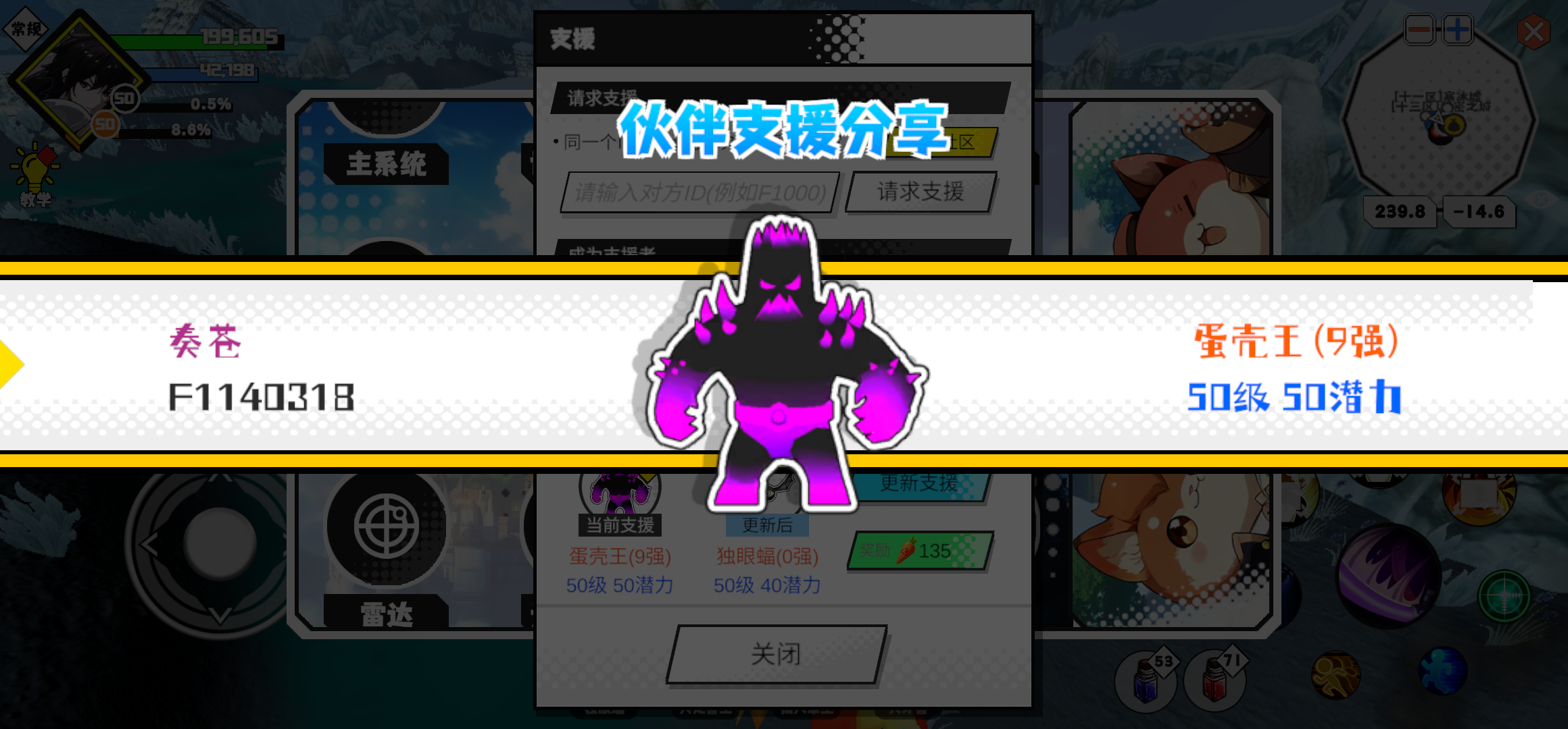 支援者:王牌飞行员(F1000606)如果遇到困难,可以召唤我的宠物帮忙,召唤方法是进入地图后点击左下角的手机功能>支援>输入【F1000606】>就可以召唤我的宠物!我的宠物是蛋壳王(9强)50级 50潜力技能1:八雷神术技能2:八雷神术技能3:八雷神术技能4:八雷神术智慧配点:245初阶职业:鬼咒进阶职业:海神#超数据世界
