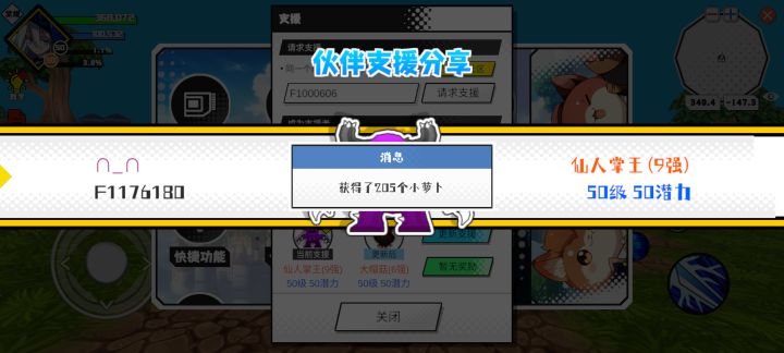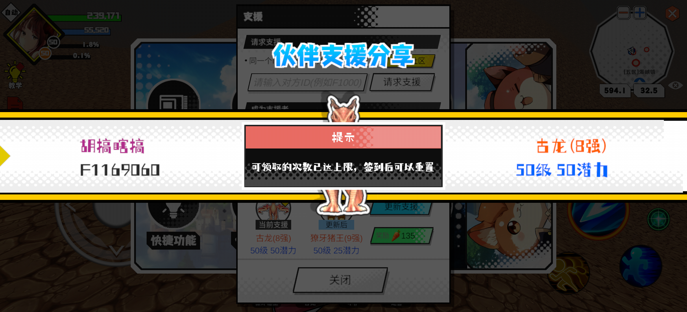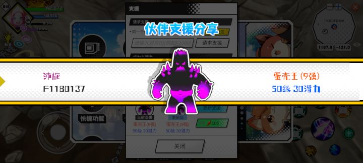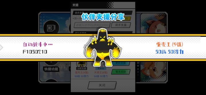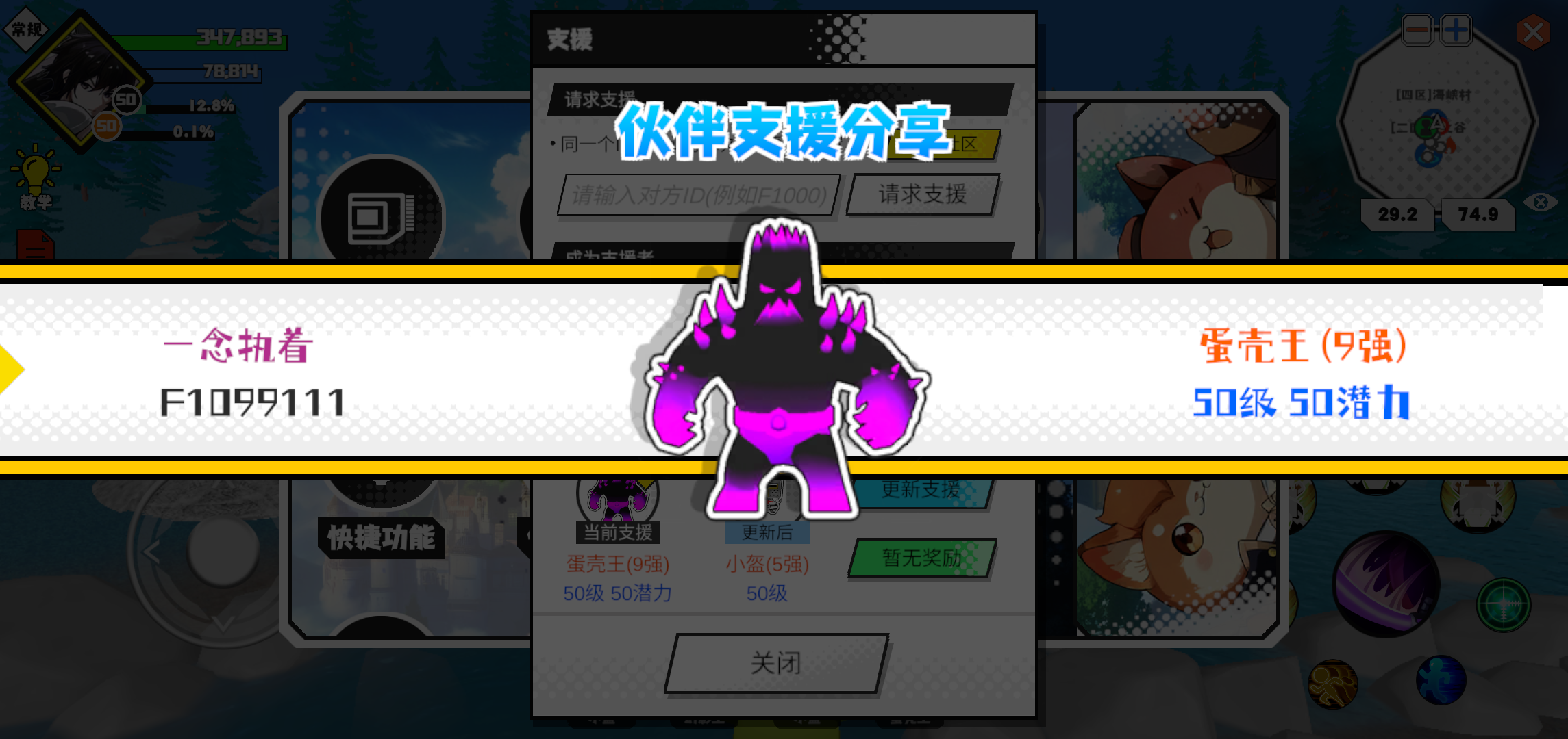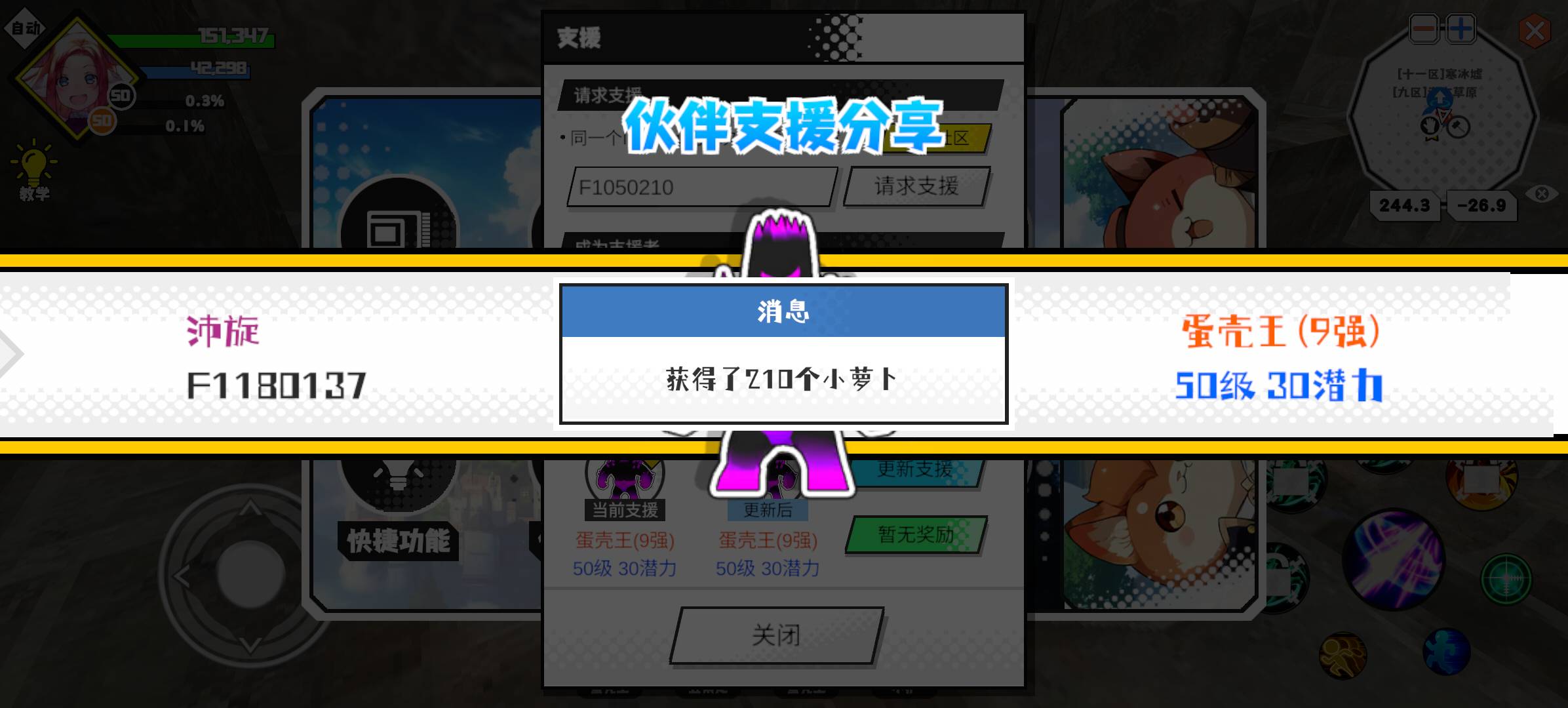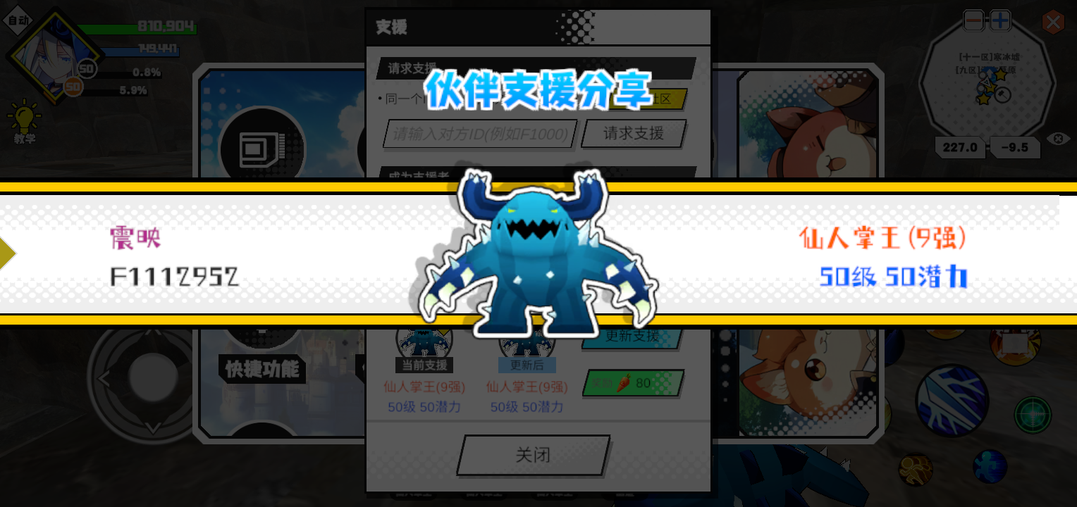 支援者:自动战斗中…(F1050210)如果遇到困难,可以召唤我的宠物帮忙,召唤方法是进入地图后点击左下角的手机功能>支援>输入【F1050210】>就可以召唤我的宠物!我的宠物是蛋壳王(9强)50级 50潜力技能1:八雷神术技能2:八雷神术技能3:冰炮十连技能4:八雷神术智慧配点:245初阶职业:时导进阶职业:海神#超数据世界