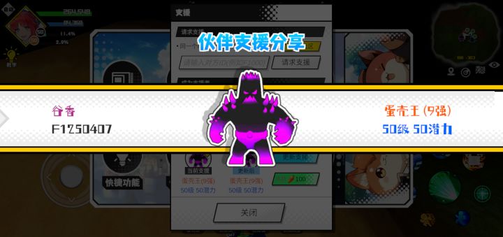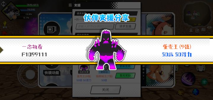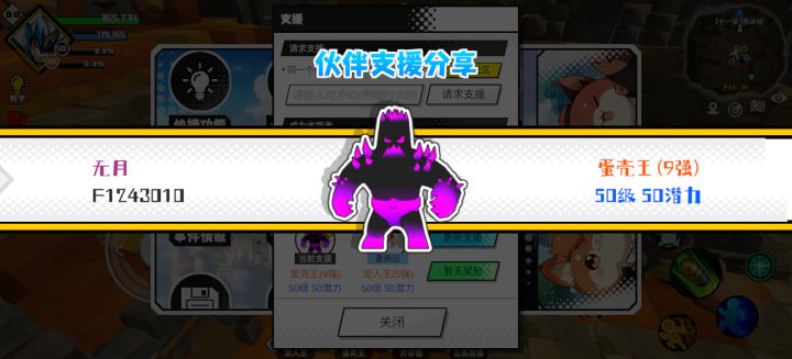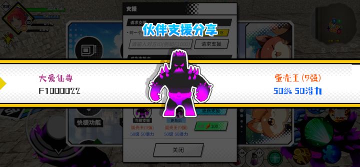 #超数据世界 支援者:胡辣汤(F1231228)如果遇到困难,可以召唤我的宠物帮忙,召唤方法是进入地图后点击左下角的手机功能>支援>输入【F1231228】>就可以召唤我的宠物!我的宠物是蛋壳王(9强)50级 50潜力技能1:魔源技能2:黑魔破技能3:黑魔破技能4:黑魔破智慧配点:245初阶职业:鬼咒进阶职业:海神
