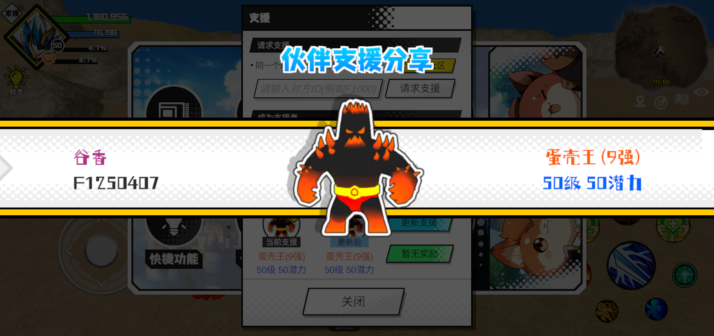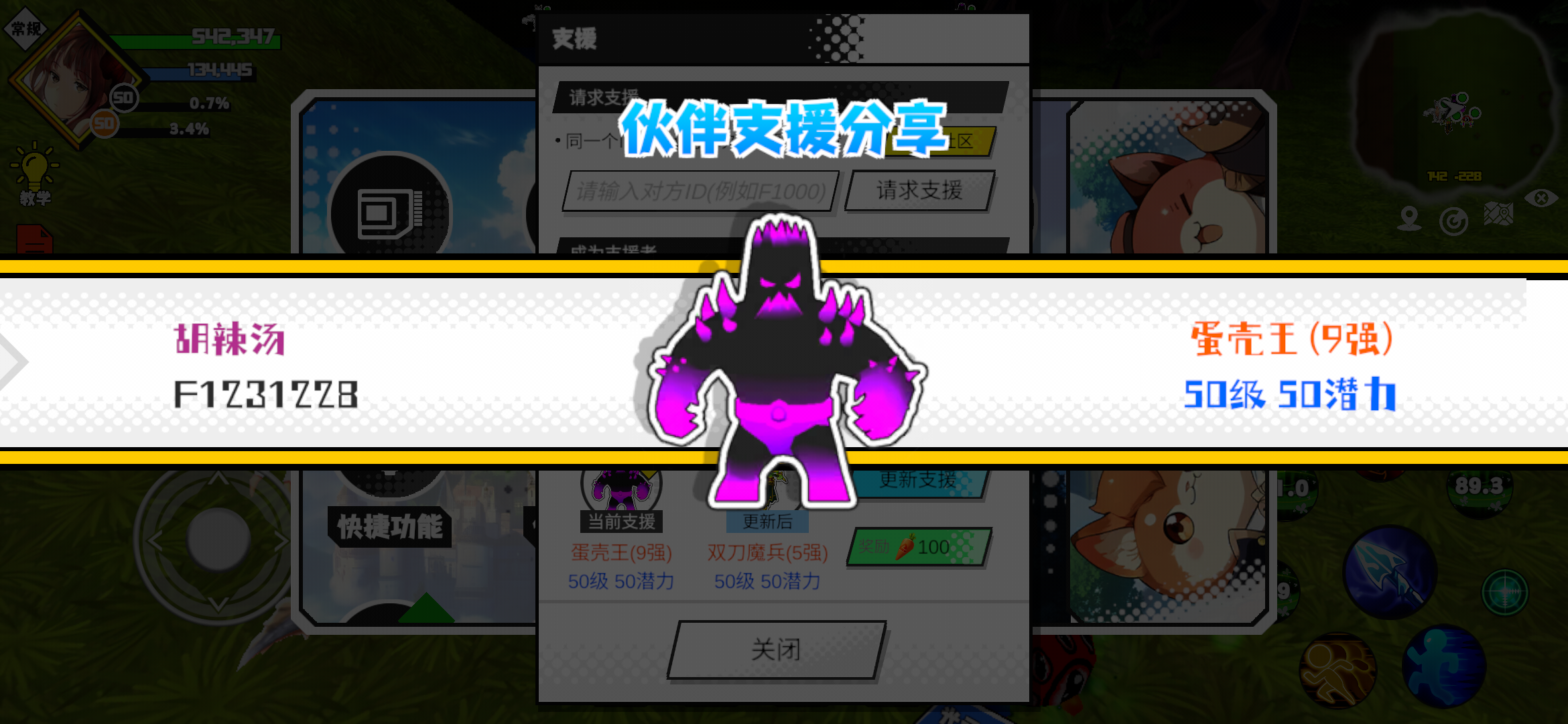 #超数据世界 支援者:胡辣汤(F1231228)如果遇到困难,可以召唤我的宠物帮忙,召唤方法是进入地图后点击左下角的手机功能>支援>输入【F1231228】>就可以召唤我的宠物!我的宠物是蛋壳王(9强)50级 50潜力技能1:魔源技能2:黑魔破技能3:黑魔破技能4:黑魔破智慧配点:245初阶职业:鬼咒进阶职业:海神