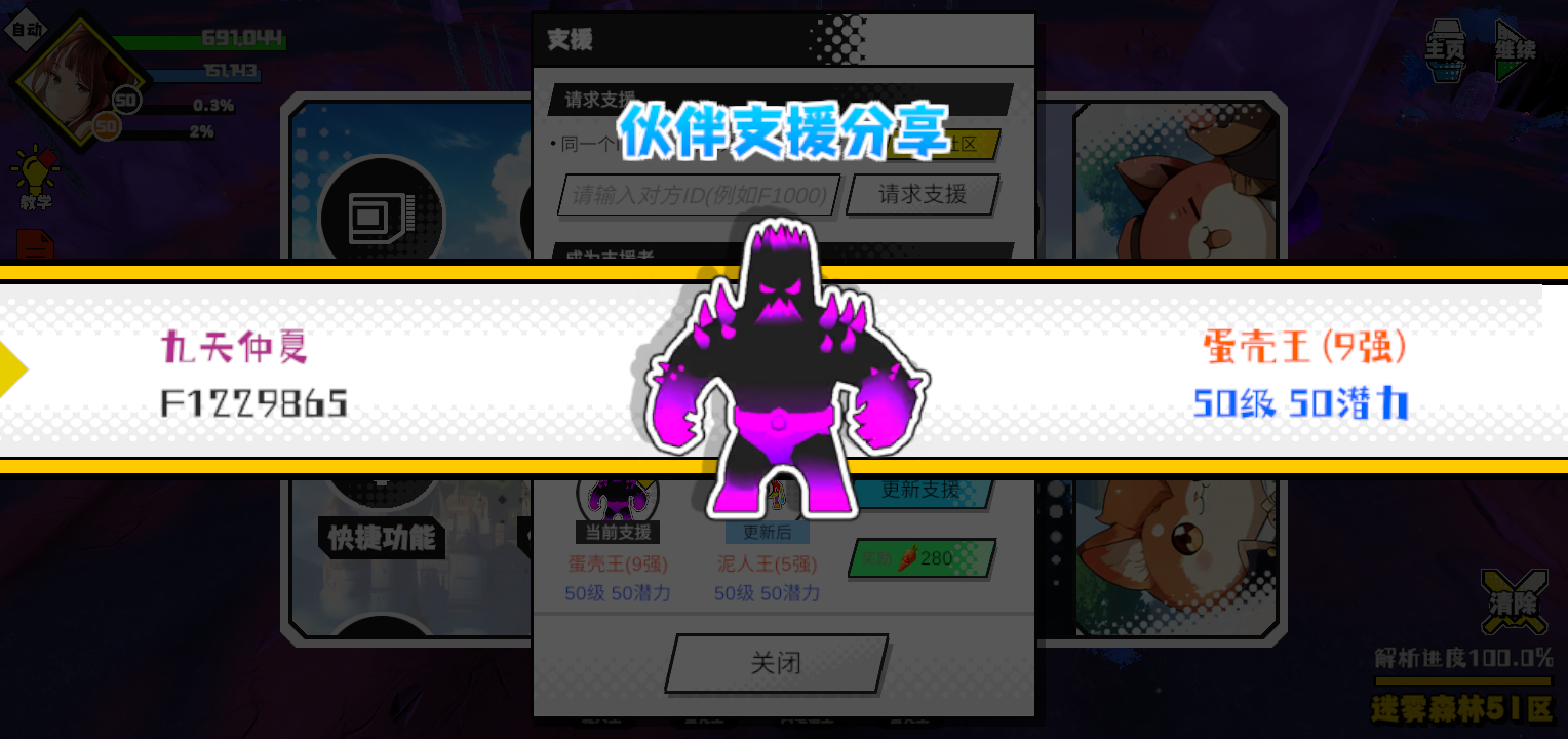支援者:胡辣汤(F1231228)如果遇到困难,可以召唤我的宠物帮忙,召唤方法是进入地图后点击左下角的手机功能>支援>输入【F1231228】>就可以召唤我的宠物!我的宠物是蛋壳王(9强)50级 50潜力技能1:魔源技能2:黑魔破技能3:黑魔破技能4:黑魔破智慧配点:245初阶职业:鬼咒进阶职业:海神#超数据世界