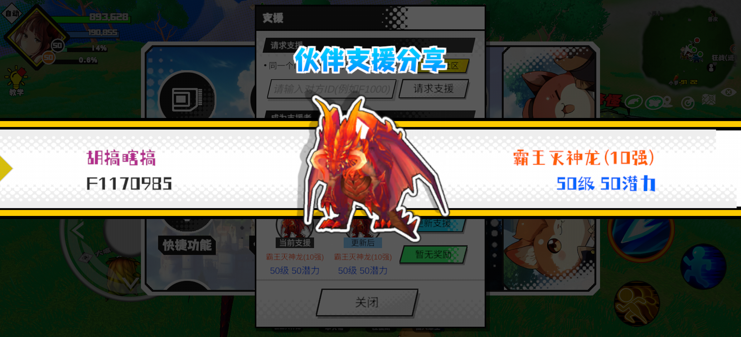 支援者:胡搞瞎搞(F1170985)如果遇到困难,可以召唤我的宠物帮忙,召唤方法是进入地图后点击左下角的手机功能>支援>输入【F1170985】>就可以召唤我的宠物!我的宠物是霸王灭神龙(10强)50级 50潜力技能1:火之意技能2:魔源技能3:狂风咆哮击技能4:狂风咆哮击力量配点:215敏捷配点:30初阶职业:暗猎进阶职业:无极#超数据世界