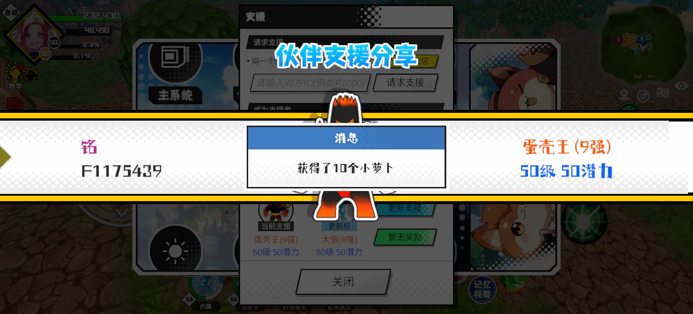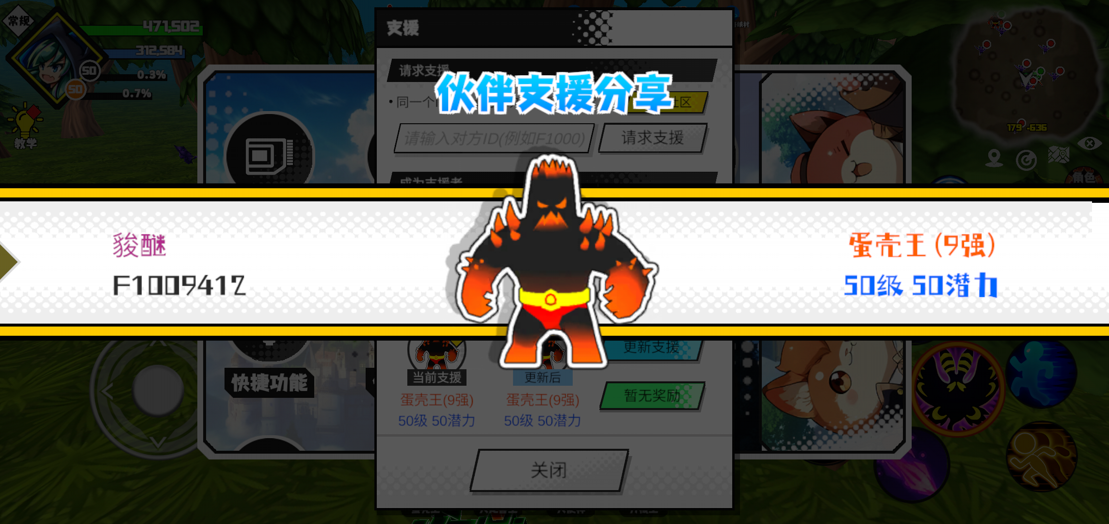 支援者:铭(F1175439)如果遇到困难,可以召唤我的宠物帮忙,召唤方法是进入地图后点击左下角的手机功能>支援>输入【F1175439】>就可以召唤我的宠物!我的宠物是蛋壳王(9强)50级 50潜力技能1:黑魔破技能2:黑魔破技能3:黑魔破技能4:黑魔破智慧配点:245初阶职业:魔导进阶职业:海神#超数据世界