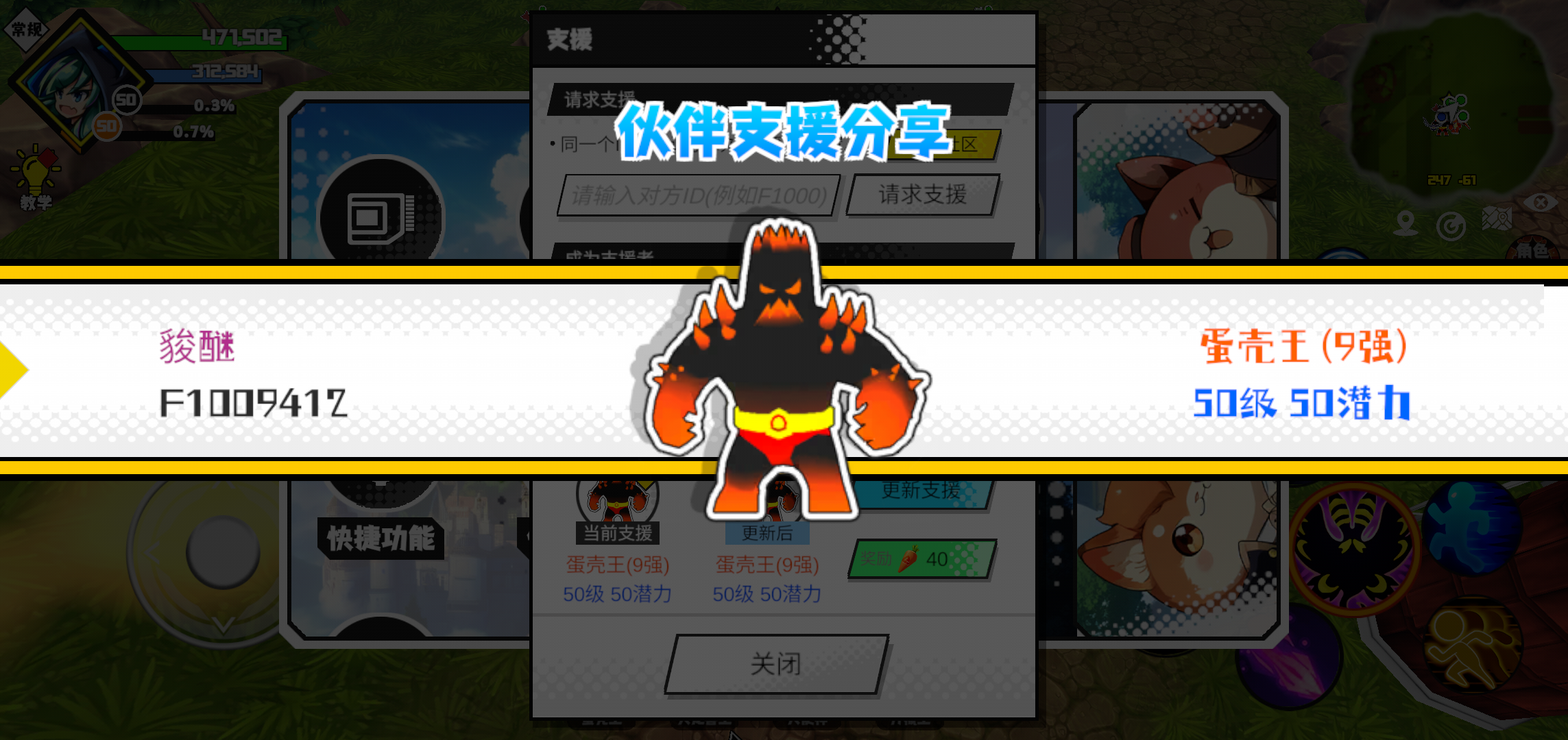 支援者:䝜醚(F1009412)如果遇到困难,可以召唤我的宠物帮忙,召唤方法是进入地图后点击左下角的手机功能>支援>输入【F1009412】>就可以召唤我的宠物!我的宠物是蛋壳王(9强)50级 50潜力技能1:火焰破技能2:火焰破技能3:火焰破技能4:火焰破智慧配点:245初阶职业:鬼咒进阶职业:海神#超数据世界 #超数据世界