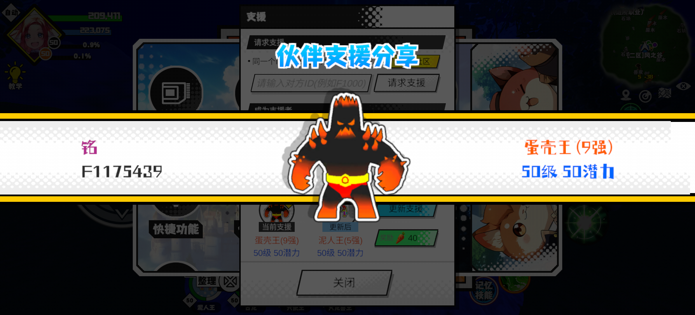 支援者:铭(F1175439)如果遇到困难,可以召唤我的宠物帮忙,召唤方法是进入地图后点击左下角的手机功能>支援>输入【F1175439】>就可以召唤我的宠物!我的宠物是蛋壳王(9强)50级 50潜力技能1:黑魔破技能2:黑魔破技能3:黑魔破技能4:黑魔破智慧配点:245初阶职业:魔导进阶职业:海神#超数据世界