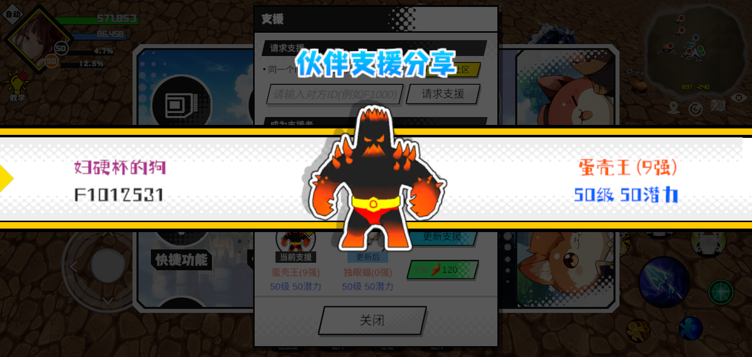 支援者:命(F1000289)如果遇到困难,可以召唤我的宠物帮忙,召唤方法是进入地图后点击左下角的手机功能>支援>输入【F1000289】>就可以召唤我的宠物!我的宠物是蛋壳王(9强)50级 50潜力技能1:火焰破技能2:火焰破技能3:火焰破技能4:火焰破智慧配点:245初阶职业:鬼咒进阶职业:海神#超数据世界
