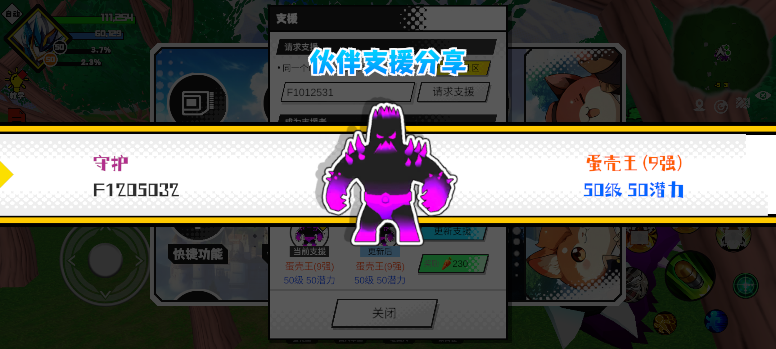 支援者:守护(F1205032)如果遇到困难,可以召唤我的宠物帮忙,召唤方法是进入地图后点击左下角的手机功能>支援>输入【F1205032】>就可以召唤我的宠物!我的宠物是蛋壳王(9强)50级 50潜力技能1:黑魔破技能2:黑魔破技能3:魔炮十连技能4:智慧智慧配点:245初阶职业:鬼咒进阶职业:海神#超数据世界 #超数据世界