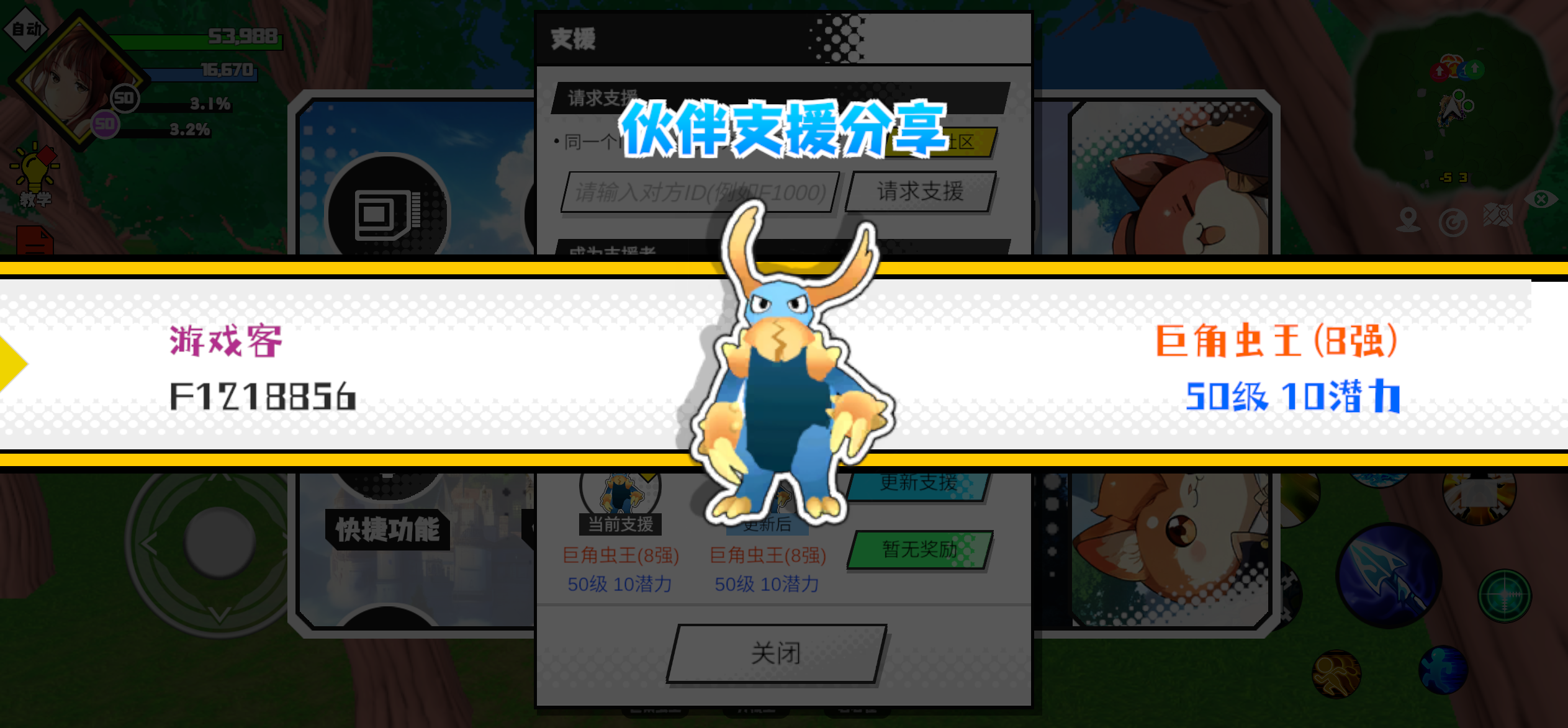 支援者:游戏客(F1218856)如果遇到困难,可以召唤我的宠物帮忙,召唤方法是进入地图后点击左下角的手机功能>支援>输入【F1218856】>就可以召唤我的宠物!我的宠物是巨角虫王(8强)50级 10潜力技能1:群体嘲讽技能2:物攻强化技能3:雷破击技能4:物理保护1体质配点:245初阶职业:守卫进阶职业:盾卫#超数据世界 #超数据世界