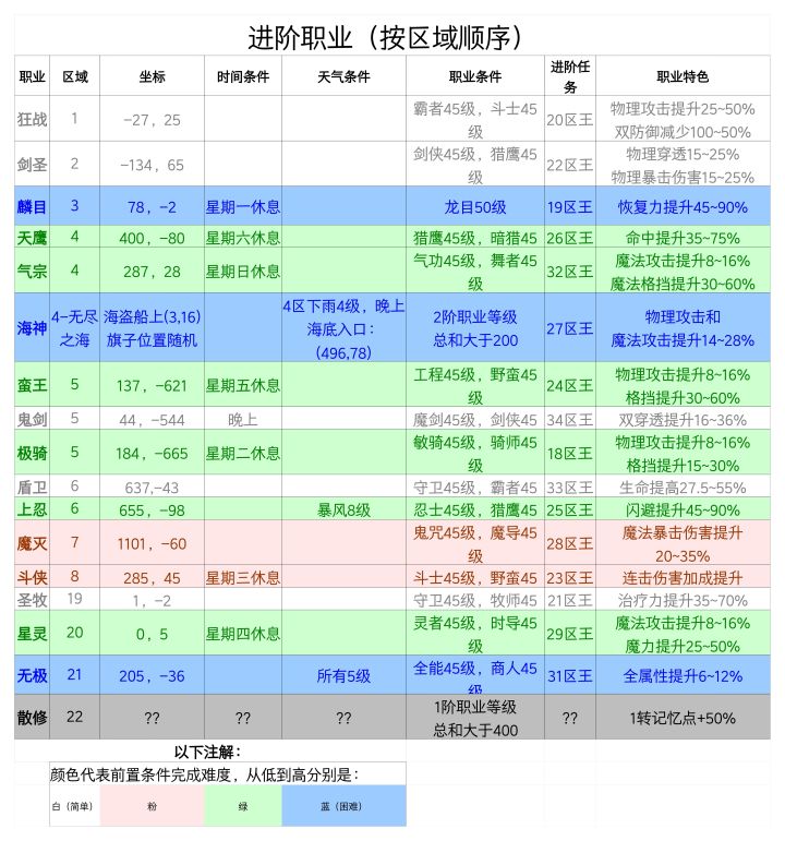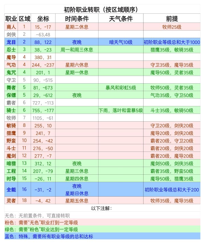 仔细梳理了各种职业的前置条件,理出了一个转职顺序表,主要那个示意图里的颜色(下边有注解