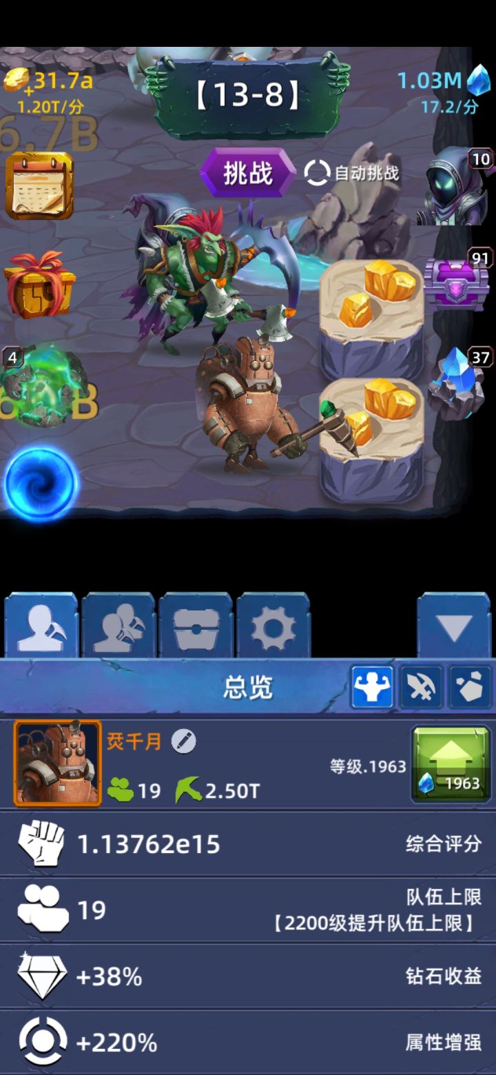 打到19-2,大概18-几的时候挂机就过不了关了😶,不是30 60 90大关,普通小关卡自动挑战也没用