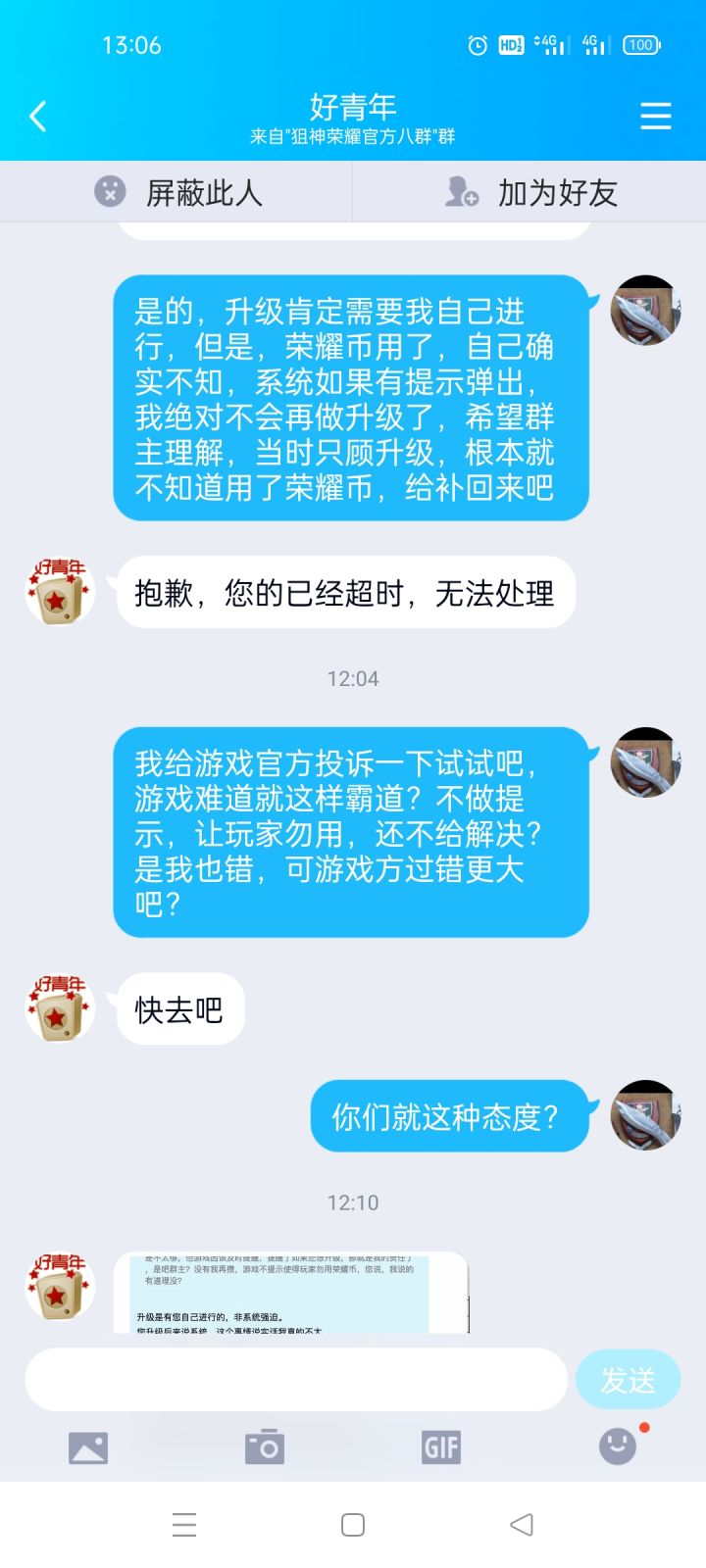 各位狙友请看,这就是官方管理人员对我说的话,我升级武器勿用了荣耀币,找管理群主陈诉,她们说已经超时,我说要投诉,她们却说(快去吧),态度无理野蛮,这游戏玩的还有点保障吗?游戏缺陷太多,比如,用胸章升级,等胸章用完,系统就因该出提示,接下来需要荣耀币升级,系统不出提示,使玩家勿用,还找不回来,装弹按钮和发射按钮离的太近,游戏中经常勿按装弹按钮,使得比赛输掉,反应好几次,就是得不到解决,狙友们,这种游戏,你们玩的开心吗?