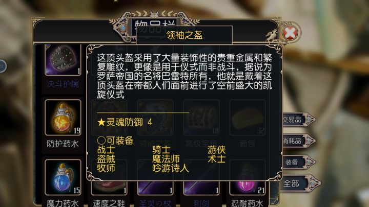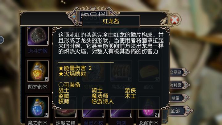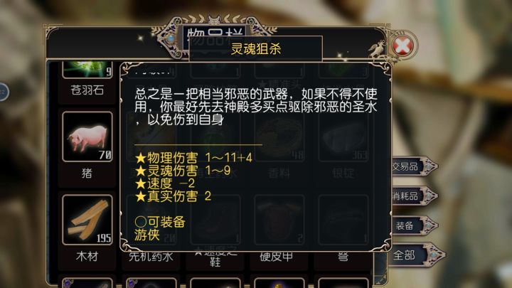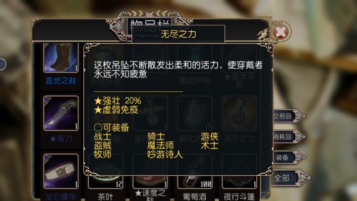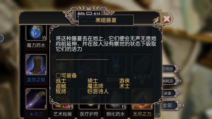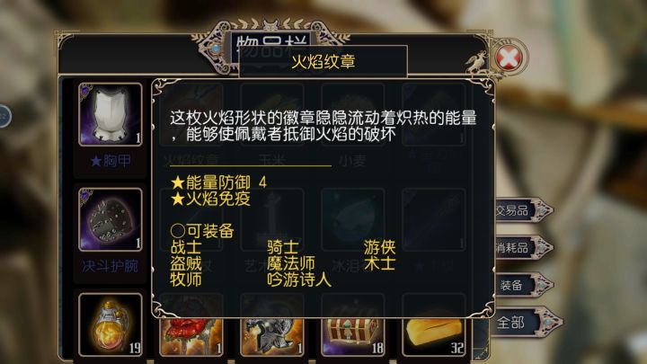 吸血鬼克星:物理/能量/灵魂防御+3,附带被动技能生命活力(效果不明),全职业通用。毒镖袋:毒镖2,技能效果:射出毒镖,可能使目标中毒(强壮判定),物理伤害,魔法消耗2星,体力消耗100%,冷却时间10秒。全职业通用。刺客的素养:夹击2,效果:邻近队友近战攻击时,消耗20%行动力对目标追击一次近战攻击。体力消耗20%,cd1秒。全职业通用。光明之心:全职业通用,物理/能量/灵魂防御+3,盲战