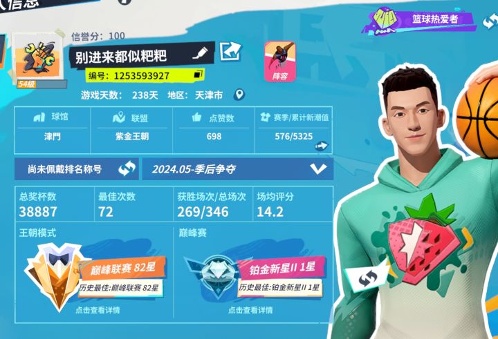 每周球馆赛都单排找人,实在太慢了,有没有一起打球馆赛的,也不要求多高战斗力,起码别是新手,除了塔图姆,强力角色我都有,擅长内线。前几个赛季巅峰水平#找队友