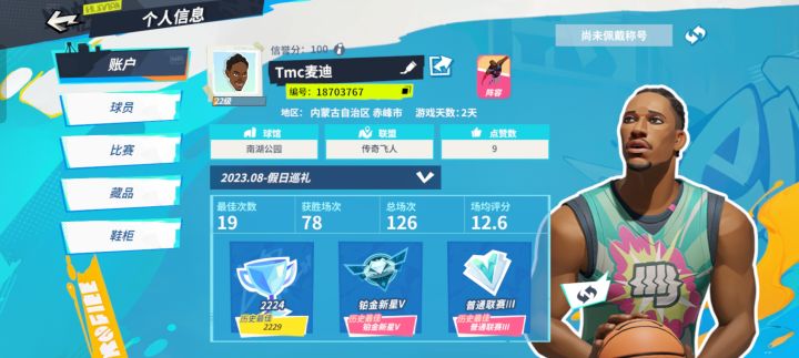 时长没显示,不过看我这等级也能看出来这两天没干别的,一直在排位,其他的我看大家都在说,我就说说这个游戏举报有用么?碰着好多把无脑就是疯狂运球然后高难度浪头的后卫,C在里面把板都抢碎了也赢不了,再不就直接挂机,游戏出去后举报也看不见反馈,整的我也想重新练个后卫了。。。玩的是真难受