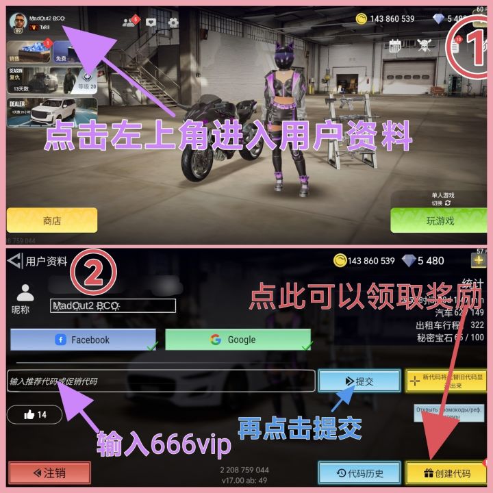 火力全开2新手兑换码,返回主大厅点击左上角进入用户资料界面,输入 666vip 即可领取15w金币和225钻石#火力全开2城市狂热 #madout2bigcityonline