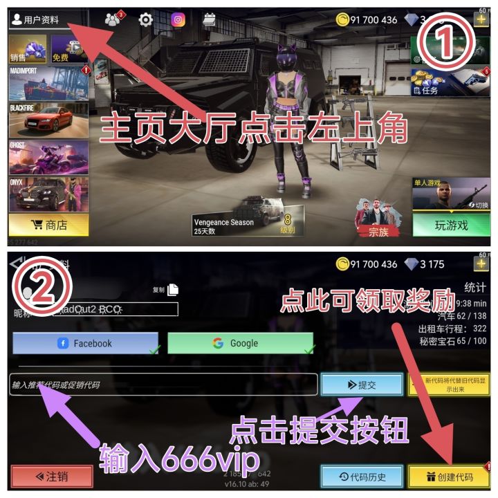 火力全开2新手兑换码,返回主大厅点击左上角进入用户资料界面,输入 666vip 即可领取15w金币和225钻石#火力全开2#madout2bigcityonline