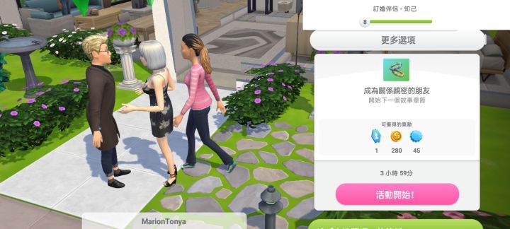 模拟人生移动版结婚攻略1、约会与喜欢的异性任务进行交谈,进行咖啡厅约会,进行互动,持续1小时后就可以成为情侣了。2、培养感情情侣之间问候,互动和交流都能增加相互的感情。3、短暂相处有了一定的感情基础,就可以相处在一起了。4、成为亲密两人最终相处久后就可以成为亲密的关系了。5、最终解锁关系,踏入婚姻的殿堂,水到渠成,但需要一定的时间培养过程。