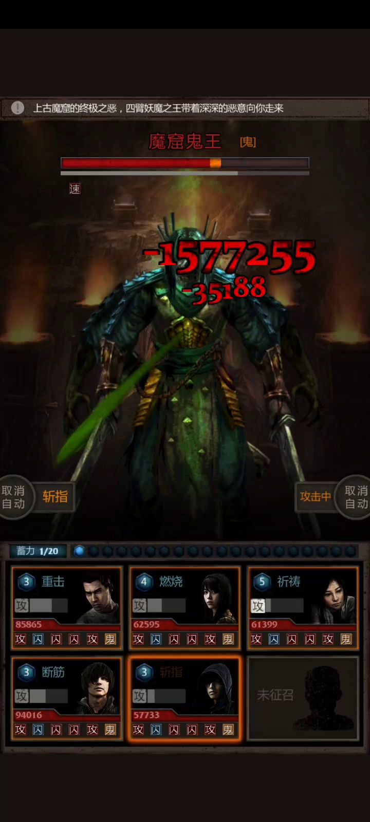 完结撒花!吕烽 赵曰天 龙 五星,九妹 薇丽杨 四星+5。镜子双鬼五岳全十级。全员千钧霸命披风捉影,吕薇赵龙乱鬼散,九妹乱鬼膏,薇赵龙追月,(律鬼丹27层用完了就没吃。 具体打法:龙开局斩指三次,然后九妹上燃烧,这时boss大约半血。然后攒豆,boss会在大约20%血的时候开邪咒重击秒龙,所以要预判在他重击那回合之前 龙斩指把豆用完,然后就可以等boss被烧死了。