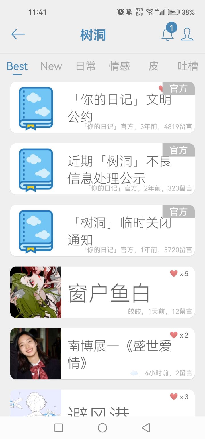 太难了,以前喜欢在树洞发文章交朋友,现在偶尔还能收到他人发的消息,我是真的怀念过去。官方啊,你要给力啊,大不了我给你充钱,赶紧修复树洞功能吧!