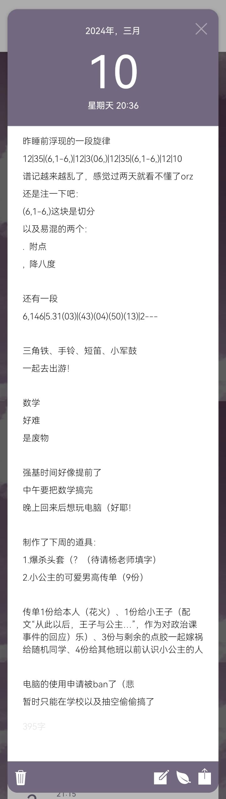 07高一生,虽然是理科生但对文史的东西也有一定兴趣,喜欢玩(但宅),爱好比较泛,大多是一时兴起这样子记录的内容包括:日常觉得有趣的事、灵感、一些情绪和吐槽日常的部分会占比多一些,比较琐碎,偶尔有整活记录灵感的东西主要是一些乱七八糟的想法,有时可能会突然写很多,写多的话语言可能会比较绕情绪的东西可能会比较摆(但不要真的烂掉),会有激进的时候接近日更,但可能会突然断掉一两天,可能是比较忙,也