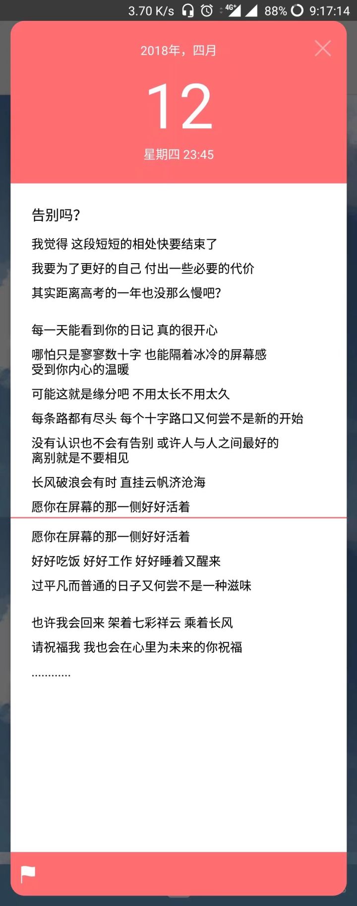 我和笔友相遇于,五月份左右,笔友的第一编日记;你的过去,我不曾参与,但是你的未来,我奉陪到底。去微博大海捞针,也没见笔友的综影,笔友是一个比较爱画画的女孩。笔友好像读初二,大概零六左右。已知的线索的知,地生中考也考完了笔友也许的了手机,但是笔友去姗姗来迟,没上线……笔友陪伴了我写了快一个月的日记。在我情绪没好时,笔友也会接住我的没好的情绪,也会给我许些安慰。没通关的游戏,没见过的风景,再