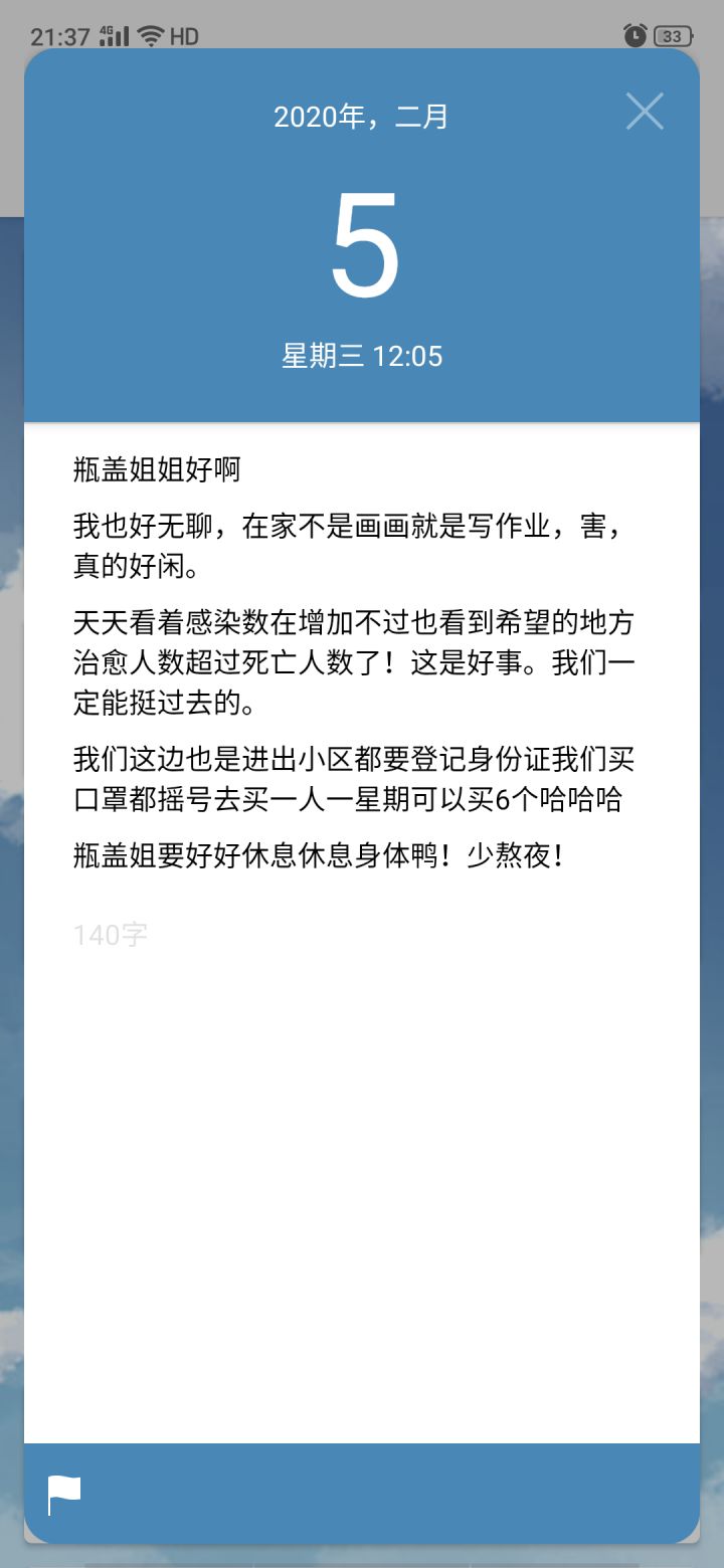 前段时间匹配到一个叫青罗的妹子,头像是个拥有让人羡慕的发量但是神情却看着有点忧伤的女孩子。自匹配一来,她差不多都是日更的状态,倒是社畜大叔我偶尔发点流水账。然而,这几天这个妹子突然就没写日记了,将近十天没有登录了。在国内冠状病毒肆虐的情况下突然消失了近十天,大叔我实在有点担心她的状况。可以没有联系的方式,也不晓得她是哪里人。希望她平平安安的吧