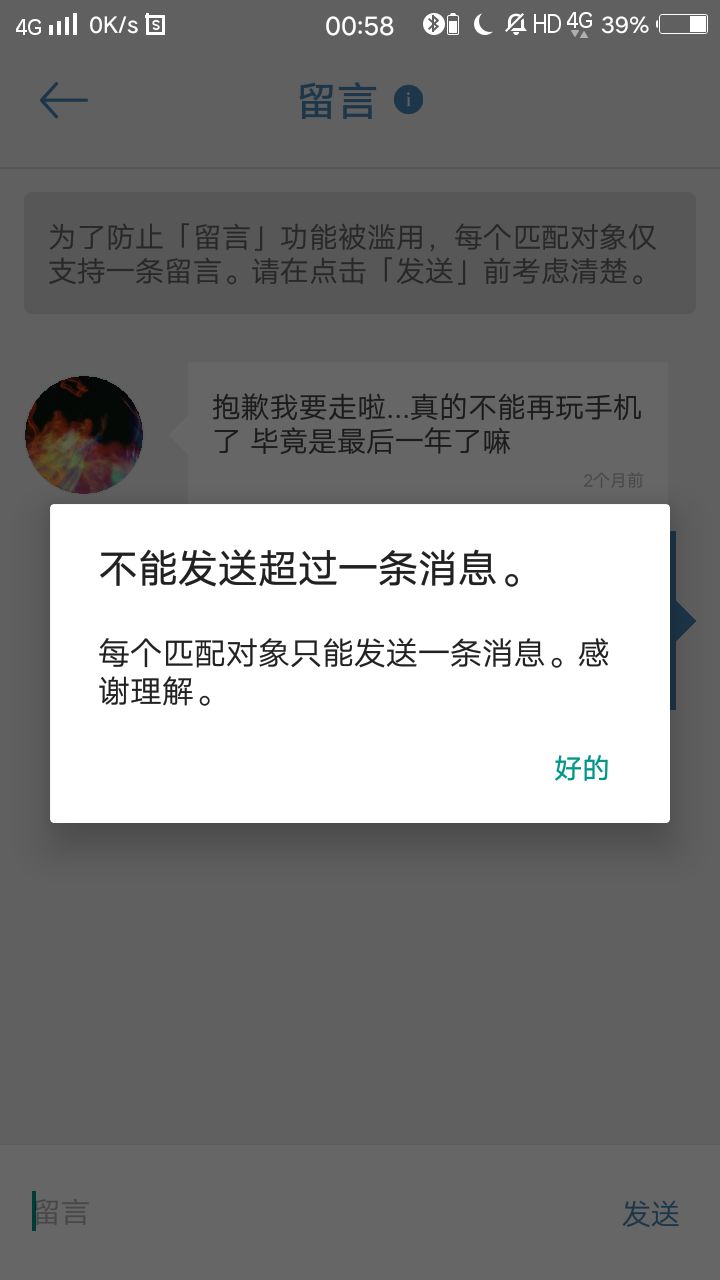 两个月了我本来是一个浑浑噩噩度过每一天的家伙这两个月虽然说不上每天都写但一个星期也会写3篇左右她有一天早上说她因为高三不再玩手机了我就私自约定一年后再向她发起重连因为重连只能连接最近三次的所以我一直不敢再匹配生怕把她的匹配记录弄没了我和她的连接时间不算长正好20天但她却是我连接过的人里时间最长的最近想到了论坛想来碰碰运气看能不能找到她我想她了她是第一个在这个软件里
