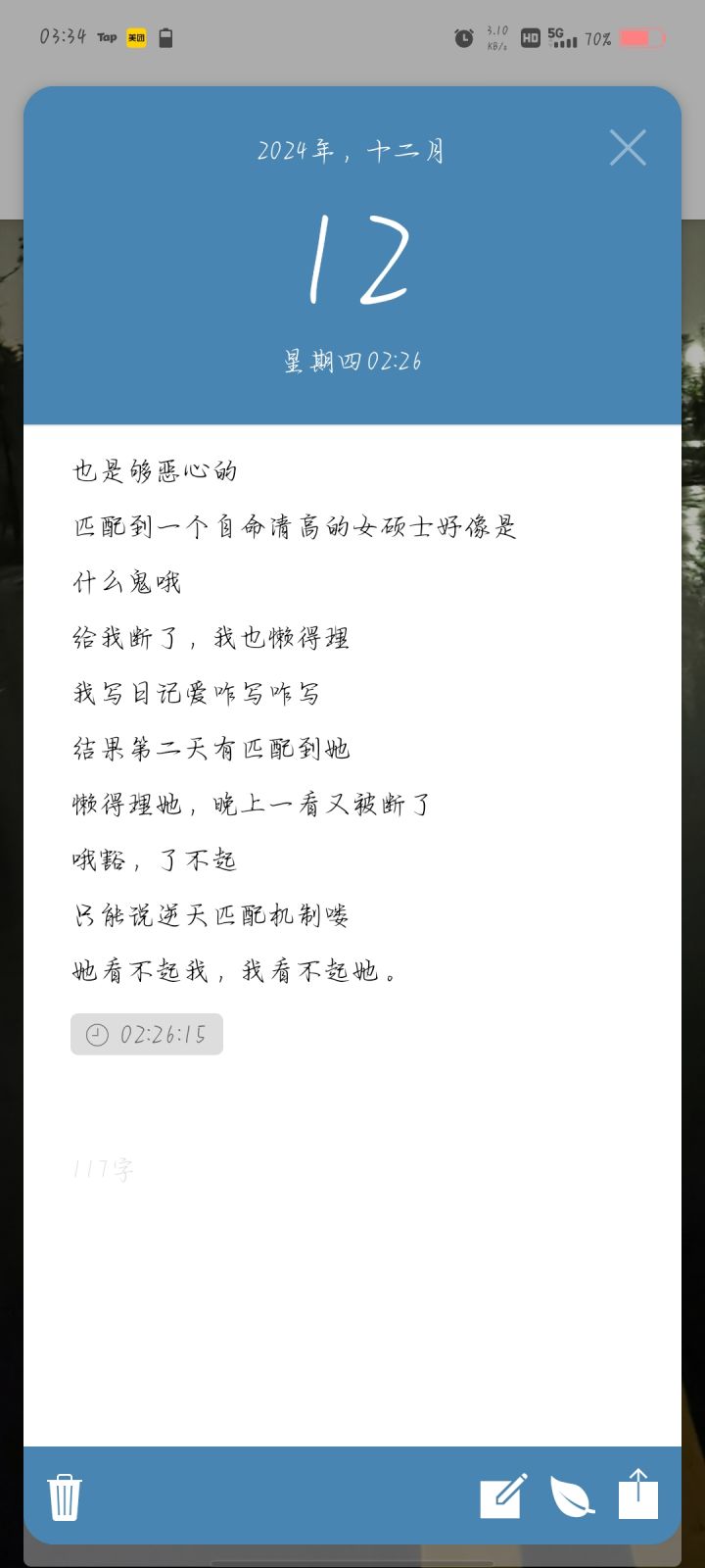 已经连续匹配+解除了好几天了,感觉每天匹配到的人都是那种像发朋友圈似的写日记的人,我不喜欢这样的日记,我喜欢大段大段的日记,即使他很久更新一次qwq