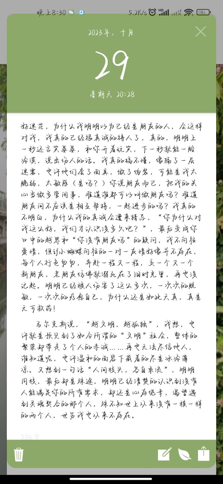 现如今我们很少在日记里互动,而这正是我需要的。是参与者,同时也是旁观者。我把一切说的很开,硬要说的话就是还没来得及打招呼就被死神一脚踹回来后好像也没什么不能接受的。而就像我一直尊重他人的选择,她也同样尊重我的选择,我很感谢她没有因为我持续的负能、看起来有违理性主义者的行为断开连接,愿意继续分享彼此的日常,哪怕有时候是我清醒状态下也不能理解的胡言乱语。虽然我已不似早年那般自我否定到****,而是选择接受这样一个不美好的我,但我仍然觉得能遇到她、遇到列表是件很幸运的事。