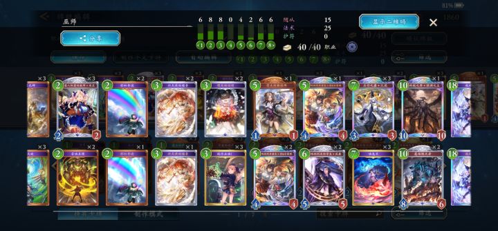 字数限制,下面分享一下个人的一些小经验:1.构筑方面,按环境决定,不过有些卡是基本上固定的。虹卡10张必带:3超越3双姬3久苑1撒旦,低费过牌12张必带:3智慧3彩虹3作业3炽天使,222米兰一般带3张,用于5费没有双姬时进化解场,2费召唤真理带0-3张,是米兰的下位替代,根据环境来的。比如我发现目前快攻挺多,可以带一点下去打架,贪的话就不带;理光的证明目前环境带2张,但实际上前面费用非常紧凑,