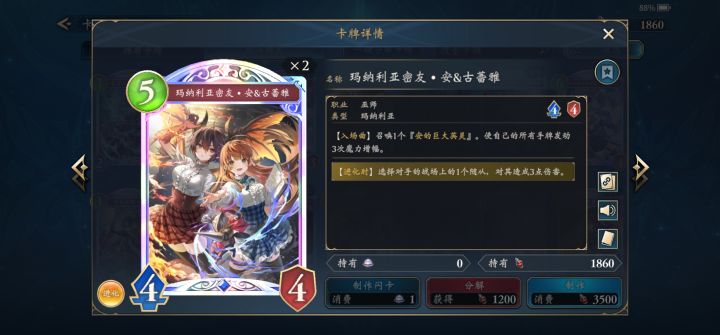 最近刚玩,2w分B0上钻,分享一下个人的看法。桃乐丝镇楼巫师1.玛纳利亚密友•安&古蕾雅cs中的cs,法师前期控场的绝对核心。想玩法爷,你可以没有3张超越次元,但你不能没有3张544。首先只吃黄色进化点,本身544进化算1个频率,打3能算1个频率,召唤544突袭算1个频率,同时544还有嘲讽--快攻人麻了。此外,还能白嫖3次增幅。身材4费,嘲讽4费,突袭算个2费,