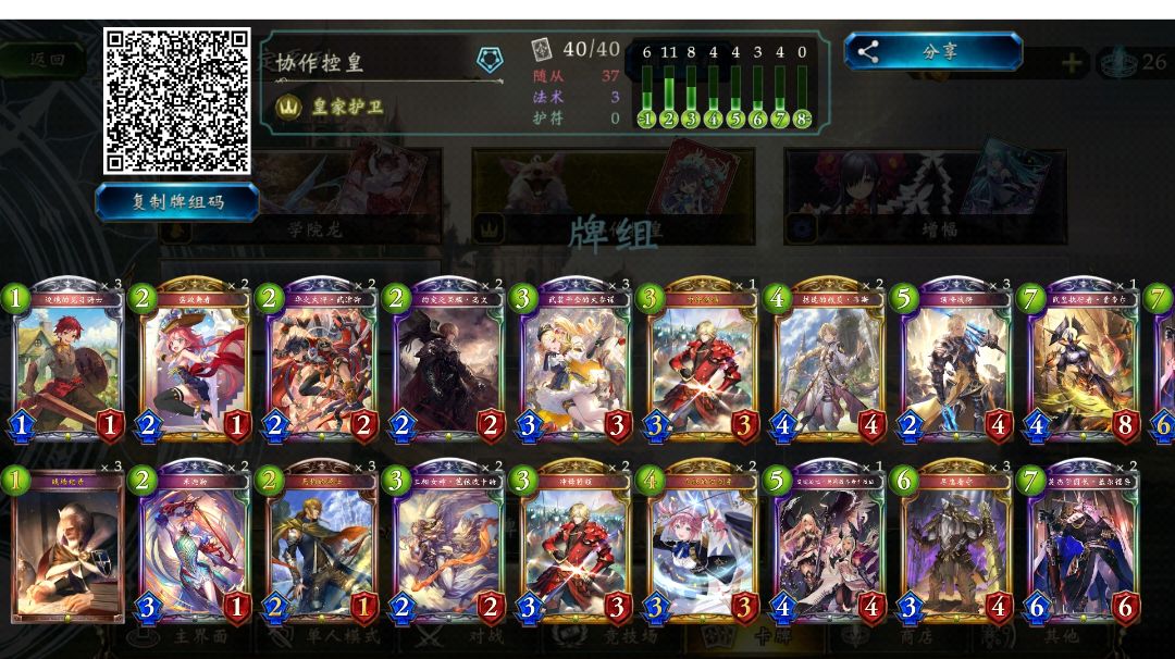 快攻脸皇,牌序正常先手5c11协作,前期做协作猛猛抢血,怕被卡场就起手留奥丁或者0费法术,6c之后花式斩杀,综合打下来就怕别人卡场和大量回复,基本6-7c决胜,7c打不死不亏牌的话还有机会赌武皇抢救一下,等不到就右上角点了下一把。#游戏种草计划