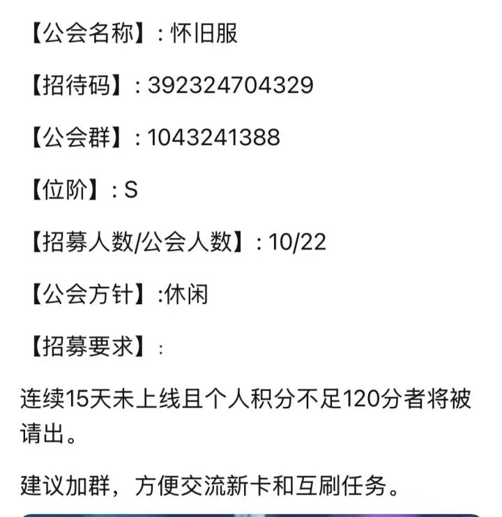 欢迎各位牌佬呀,希望能来肝帝牌佬qwq,小公会很缺积分~目前有10个空位,目前是s级公会来着,会定期清一下15天及以上不上线的成员来着,唔姆。也欢迎各位来群里一起聊天呀~公会群:975193673公会招待码:885278851458#影之诗超凡世界