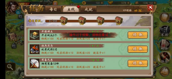 战棋三国(x) bug三国(✓) 每天上线一登录,我第一眼看见的不是华夏的辽阔河山,而是操作频繁,请稍后尝试 真的服了,服务器什么时候优化一下?bug太多了,我上个帖子刚发完没多久又出一个