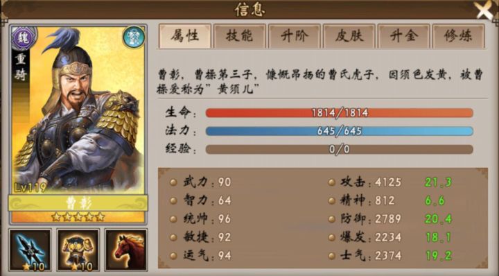 前言:感谢Q群玩家呆瓜友情提供攻略给大家分享~正文:曹彰是曹操的儿子,曹操的几个儿子除了大儿子曹昂其他都是充值将或者活动将。曹丕,曹植,曹彰,曹冲4位武将里,最有名的就是曹冲和曹植了。曹冲是大佬必备,回归流打法的核心武将;曹植是平民最好用的法师之一,推图和撸鲲必备;曹彰和曹丕的存在感比较弱,曹丕的印象就是有个谋身和五星的穿透移动的皮肤;曹彰的印象就是武力成长高和追四的皮肤,但是少有玩家关