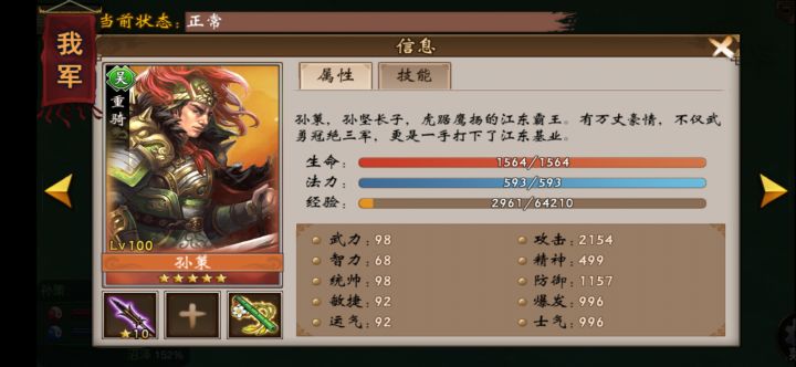 新人七天乐的活动,可以搞到四星孟获,性价比还是蛮高的,当然也有遗憾,就是不能直接买到五星,毕竟五星孟获才有皮肤,五格攻击范围的皮肤,还是很好用的。今天我们来详细介绍一下孟获。先看面板,孟获的面板很特殊,武力,智力和统帅都很高,而敏捷和爆发相对较低,这种面板,优势是相对来说,血多防高,智力不差,物法可以说是双抗,特别是有免伤装备的情况下。缺点是爆发低,普通命中低,需要其他手段弥补。 再来看技能,