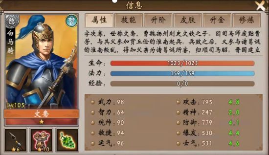 新的版本之子----文鸯前言:感谢Q群群友呆瓜提供的攻略正文:如果说以前的版本之子是赵云的话,现在的新的版本之子,毫无疑问,就是文鸯!文鸯无疑是现在最炙手可热的武将,他是隐势力武将,他的特性血战到底,独一无二,是对付仁者无敌的最有效方法之一(另一个是固伤,比如鱼肠)。今天给大家详细介绍下这个武将,而且有新的玩法哦。1.首先看面板,武力98,统帅90,敏捷94,运气96,作为一个输出型武将,