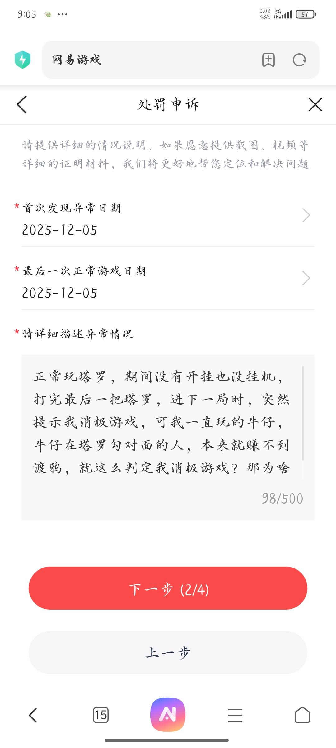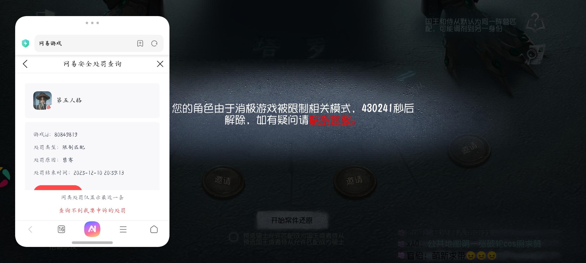 正常玩塔罗,期间没有开挂也没挂机,打完最后一把塔罗,进下一局时,突然提示我消极游戏,可我一直玩的牛仔,牛仔在塔罗勾对面的人,本来就赚不到渡鸦,就这么判定我消极游戏?那为啥不把牛仔从塔罗模式上移除?网易这鉴定简直🐮。这个账号也有用模拟器登录,是让好友用模拟器登录玩的,但他也没开过挂这些。今天我是用本机手机登录的,下午还玩的好好的,晚上我这好好玩游戏,突然被禁赛,一禁就禁五天,我的周上限怎么办?活动怎