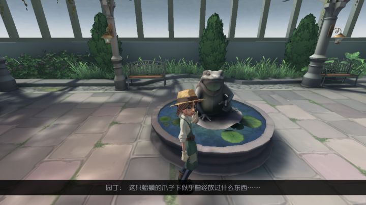 在去花园找慈善家时,只需要在草丛逛一圈把全部发光圆圈的点完就可以了。留心可以发现有一只石像青蛙是可以调查的,发现青蛙手里本来好像有些什么。点完光圈后园丁奇怪为什么找不到慈善家,触发远处稻草人的对话,稻草人说可以帮她实现愿望,园丁希望律师和慈善家不要再吵架。但其实慈善家一直在看着,也有可能稻草人就是慈善家。这个稻草人长得像什么尽情脑补吧。还有一些细节的就是医生要园丁调查雕像是要点两次的,园丁的