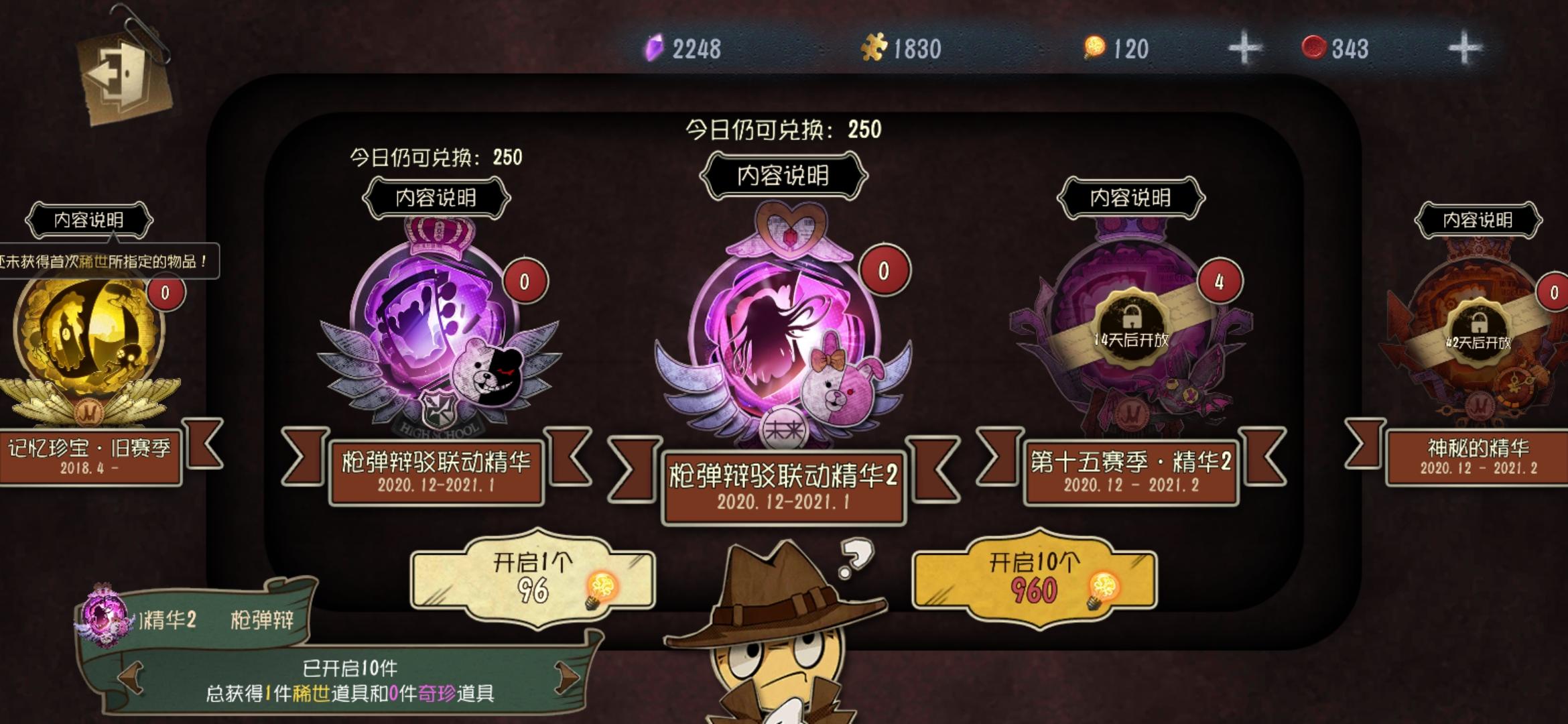 回归玩家,弃坑的时候还没出调酒和守望,所以还差这俩人,勘察员新买的,技能遛鬼治疗破译都沾点边,也不知道怎么玩。。。不过听说可能会部神座特效?期待ing
