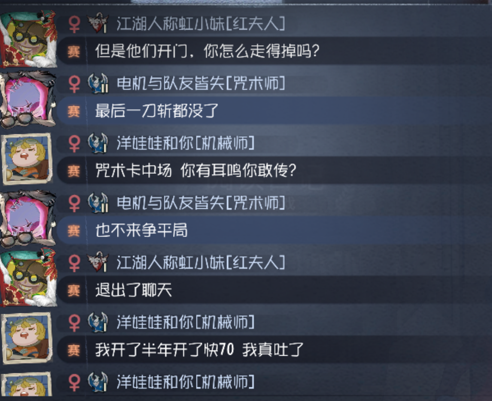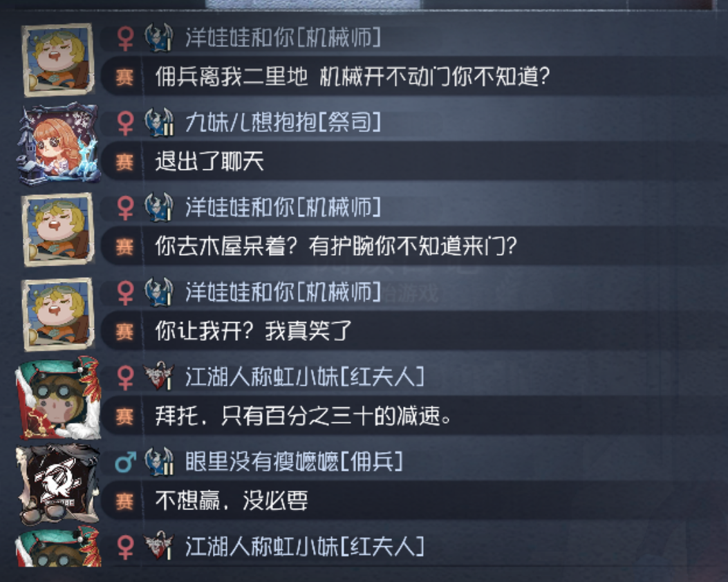 另外吐槽一下五阶混子队友对于救人位的不理解。调香溜邦邦溜到了两台半的电,我佣兵被通缉,没有先知给鸟的情况下隔着大半地图跑过去救人,交护腕其实可以不被震慑救下来的,但是我失误了,摸椅子摸三分之二就断触了(也可能是手抖了一下就断开了)总之就是没救下来我还可能会白给,于是就赶紧跑啊,想的都是保平争赢然后和队友道歉吧,(其实本来觉得没必要道歉毕竟没有人玩救人位最后我补位但通缉我也没人去救)总比白给强吧,从开始挂人觉得救人与自己毫无关系到最后调香几乎快要被挂飞都在修电的队友终于站出来了,跑过去救人可惜没救下来人飞了他还倒地了,赛后他们说都是我把节奏搞砸的,多难听的话我就不多阐述了,突然觉得巨委屈,mmp凭什么补位的人要这样被骂,是我运营好赢了只加我的分还是我失误输了只扣你们的分?别跟我说什么救人位就是混子位置,也许屠夫视角救人位是简单容易的,如果救人位真这么容易,为什么每次都是被剩下的位置呢?