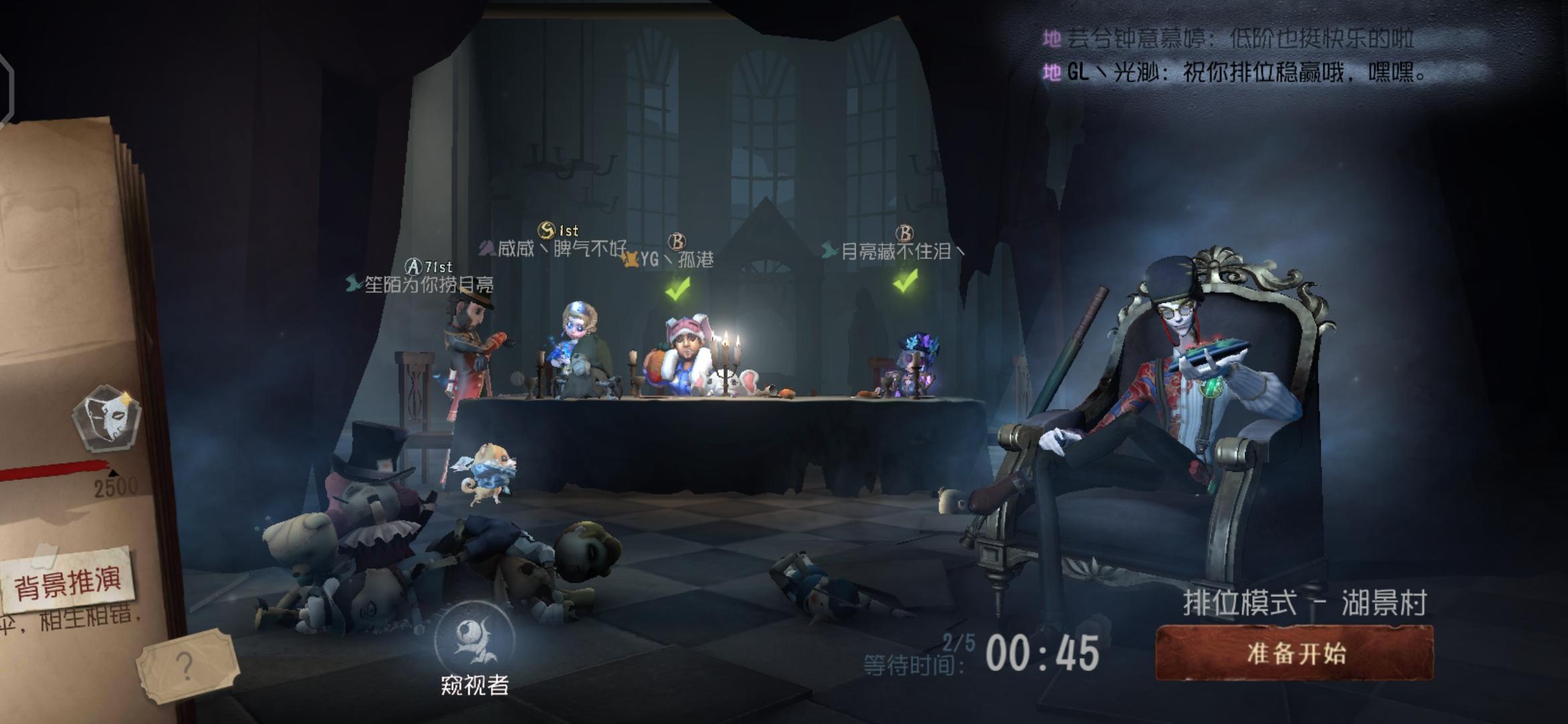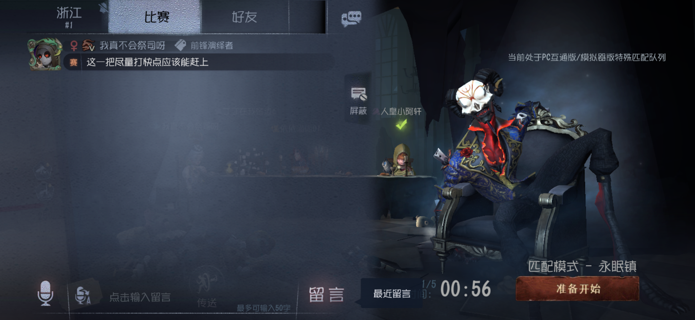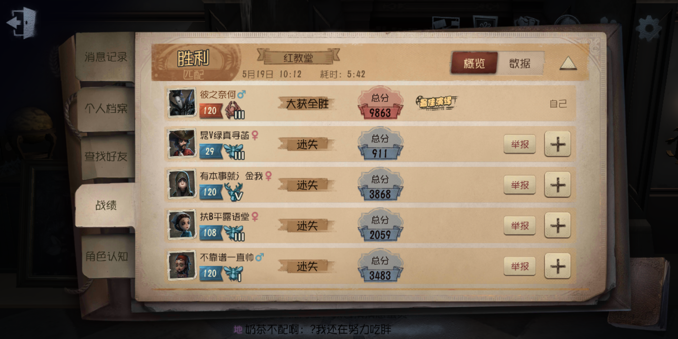 我发现第五人格人类玩家真的是惯的。打排位,差8分可以晋级。这局肯定要赢的,不然我还要再多打一局才能到晋级赛。看到对面说有晋级,一个一个点资料进去只发现对面先知晋级赛,就想着最后放先知。开局空军不交枪和我马拉松了一会儿,等于秒倒。死调香遗产。然后我卡了,重连服务器调香在身边站着,打了调香一刀,救下空军我就打调香了。先知过来白给了一刀。我肥胖流堵了一下门,先知交鸟倒地,我没挂。调香挂飞。这