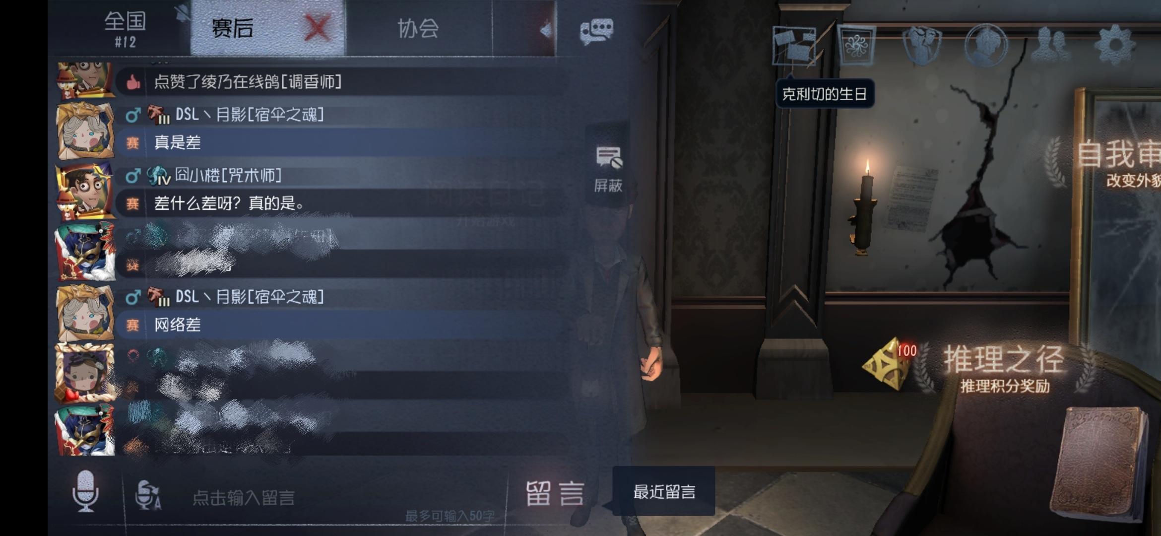 不得不说,现在的求生者玩家越来越没素质了。话不多说,看图————这个咒术师,四阶的人了,和小蜜蜂一样的行为真的迷人。场景给你们描述一下哈:地图:里奥的回忆 地点:大房外,集装箱单板我用宿伞黑魂和他博弈(板子已下),我摇铃铛他躲了,然后我利用这个机会走到他面前,他翻板我延迟刀震慑很正常对不对?赛后我吐槽了一下我的网然后。。。真的无语,还说宿伞恶心。。。双传削了,蓄力延迟也削了,还