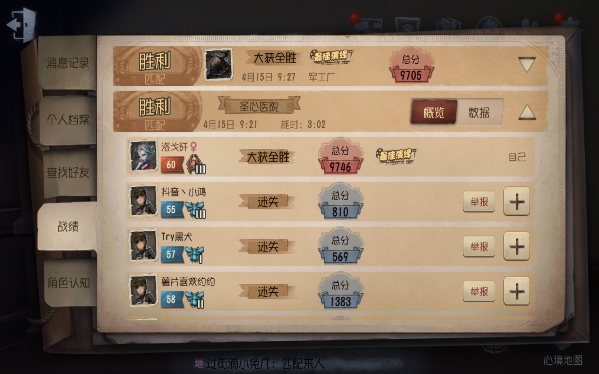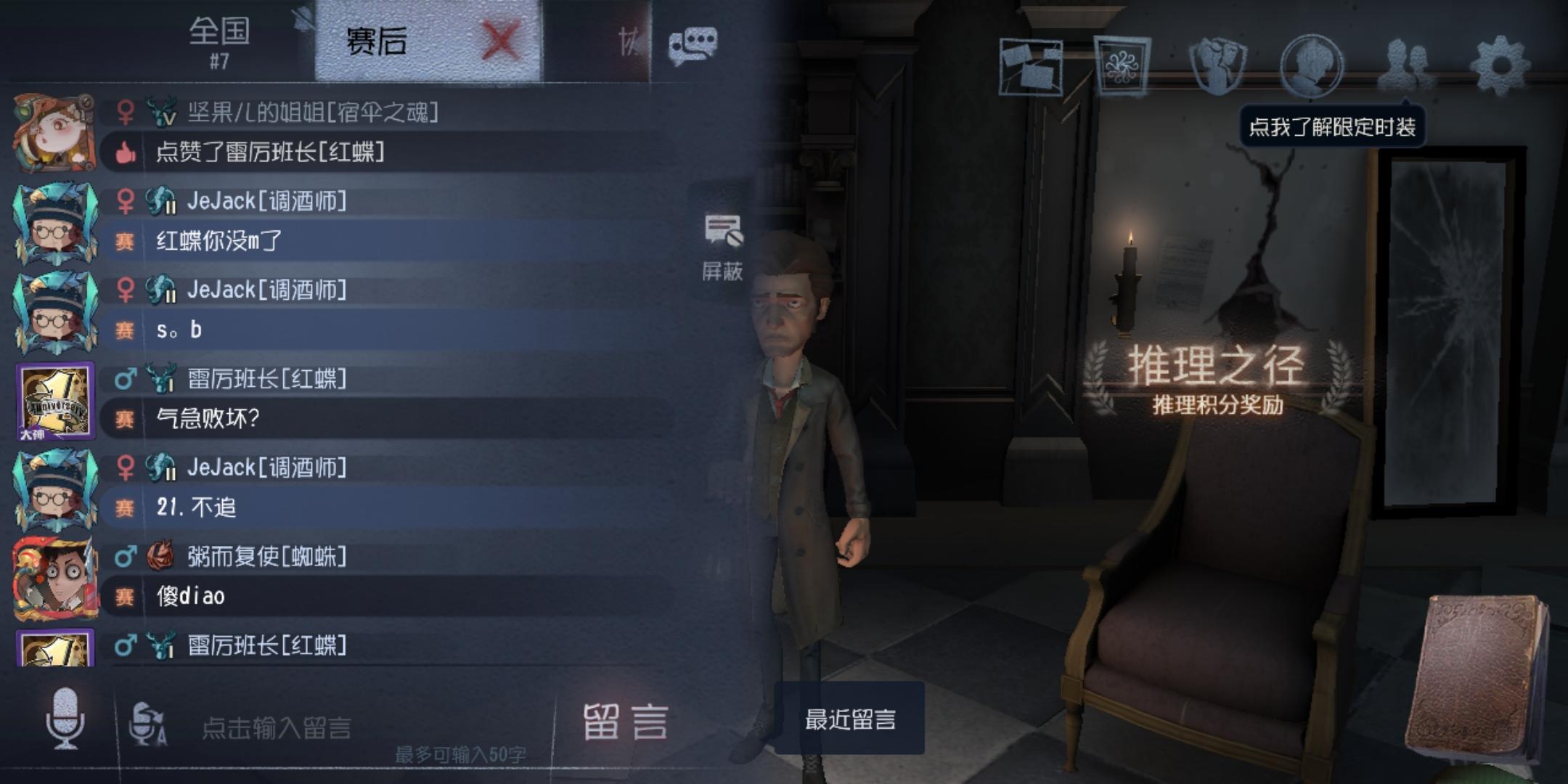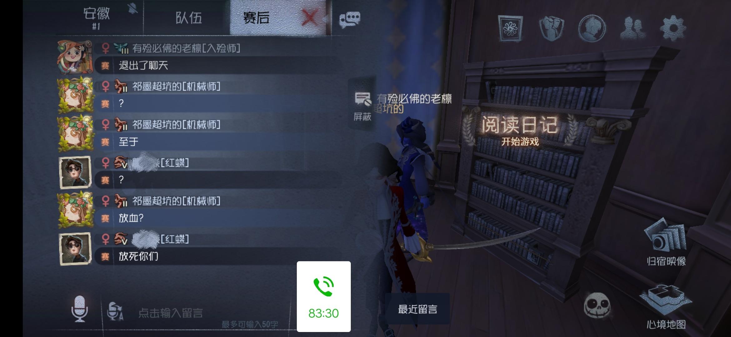 今天和朋友语音双排阵容入殓师(我朋友),机械师(我),调香师,大副其实就很平常一局,且不是排位,赛前也没说什么但进去游戏后,不得不说这个红蝶过于恶劣了可能我朋友放棺材比较好,比较隐蔽她没有找到,所以她不挂人,放了3个人的血最后我地窖跑的这其实挺生气的了,我朋友脾气比较爆,都想去骂她了,但我劝劝她也没去骂了然后我其实还是气的所以去问了她,一个游戏至不至于,我觉得我没有想骂人语气吧