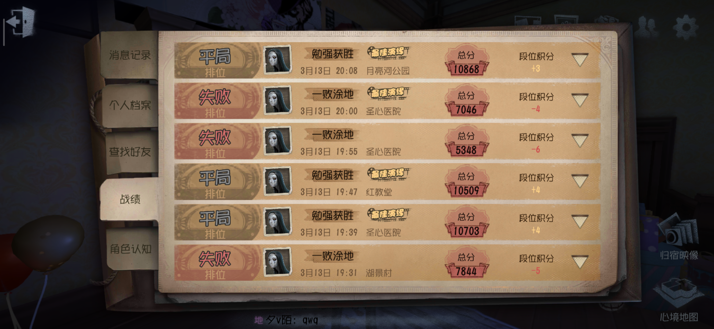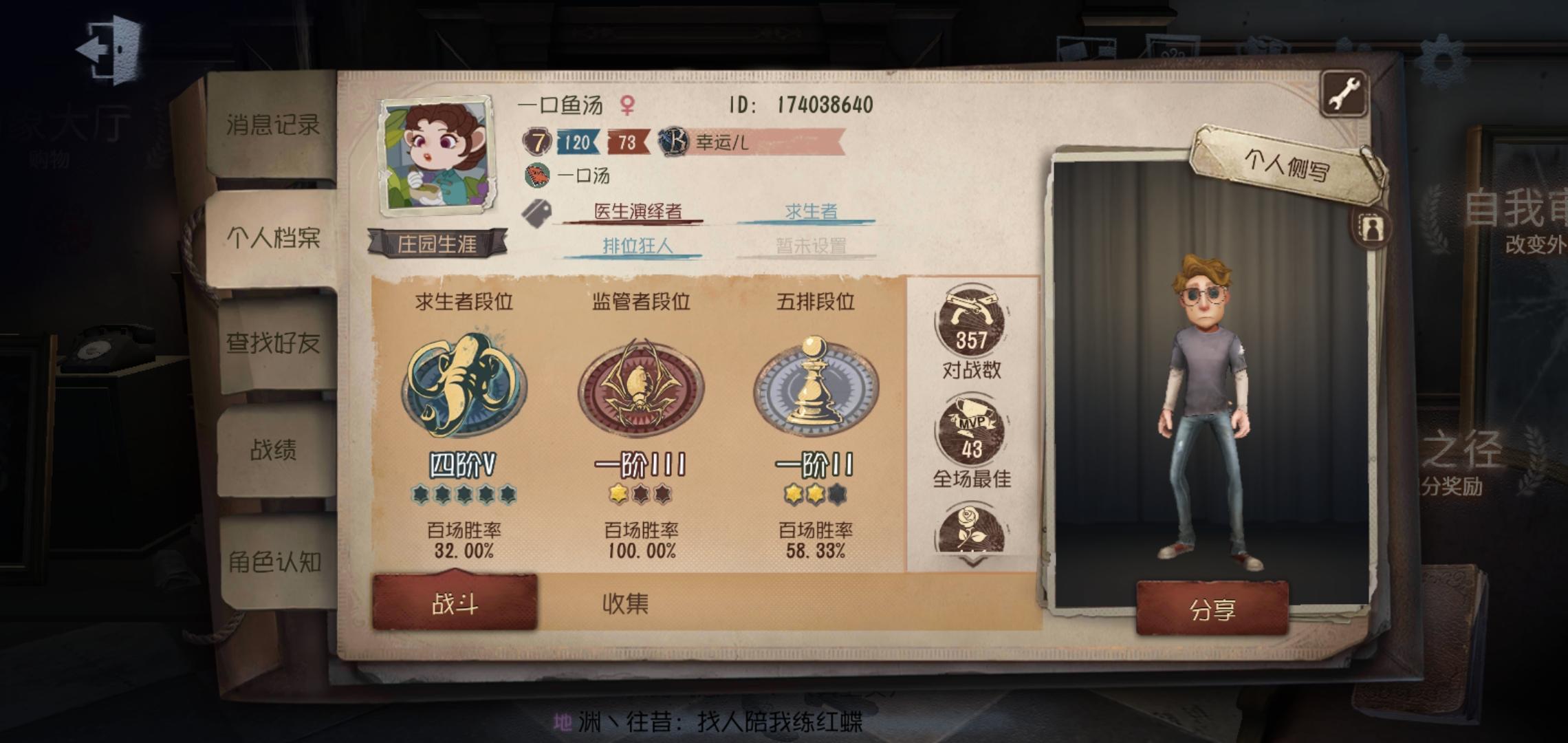 还有比我更低的么?今天打排位,心态有点崩,打了十几把,输了6吧,就赢了一把,赢的那一把还是开局舞女挂机,感觉打屠夫好累呀,看视频教学屠夫要会干扰电机,可我玩的屠夫是黄衣,杰克,安,求生一般也不会倒遗产机,安刚出来的时候感觉打排位挺强的,救人位稍微不注意就过半秒救,打双趴也挺多,但感觉现在求生者也都了解安了,救人位也不会卡那么死,也很难过半了,四阶以上段位求生都会报点了,特别是开黑队,如果第一个人碰