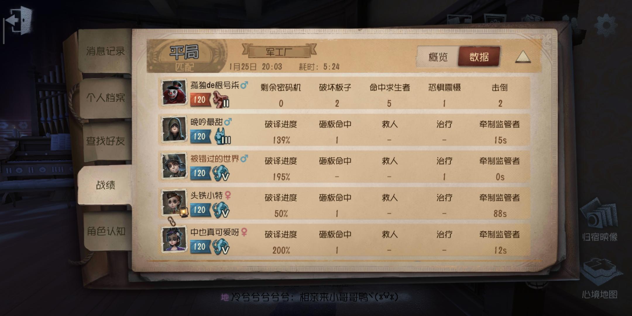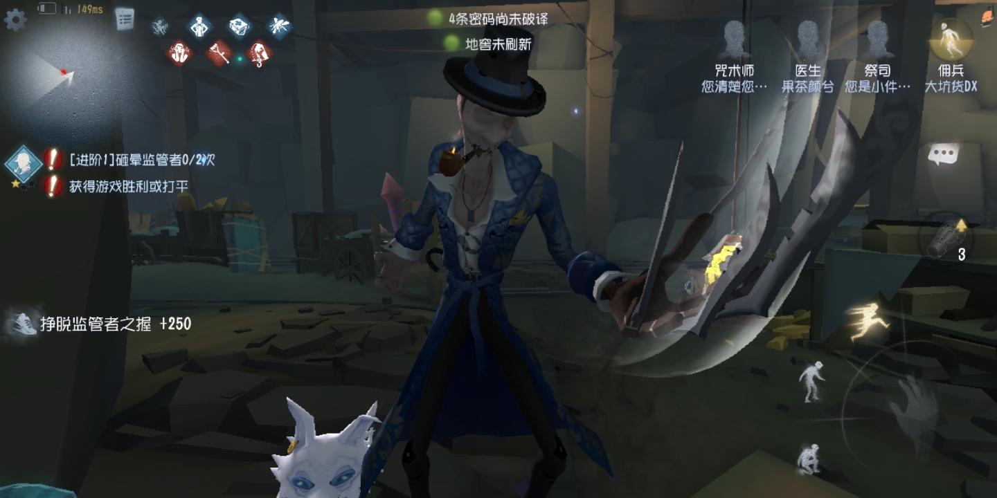 图为一个佣兵因未能牵制监管者到走而被蹲了一晚上卡尔未遂的约瑟夫玩家强行佛系……不过两个人浑身都是蓝的诶