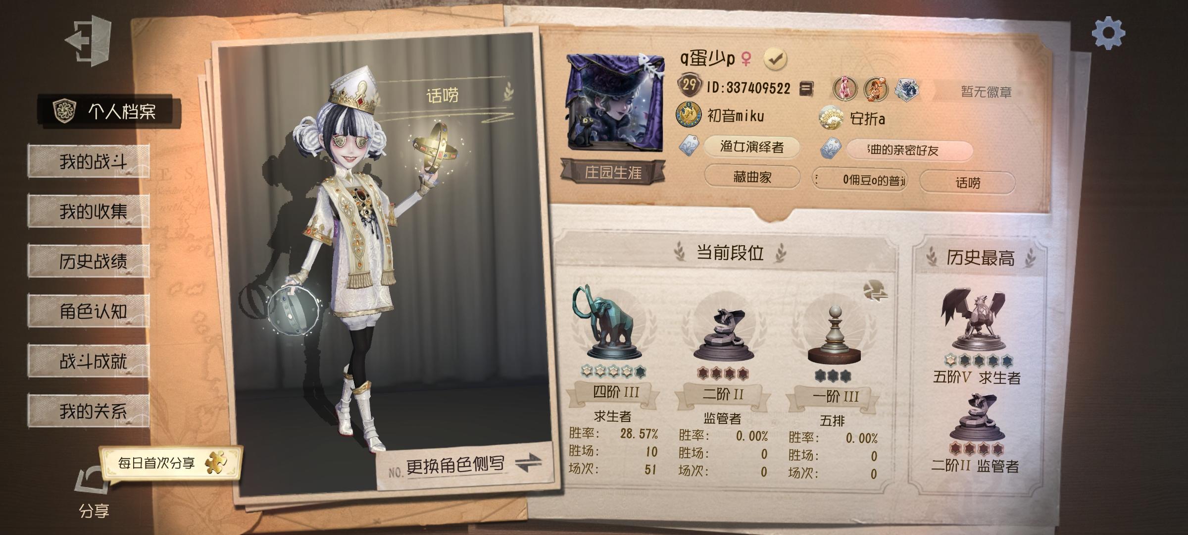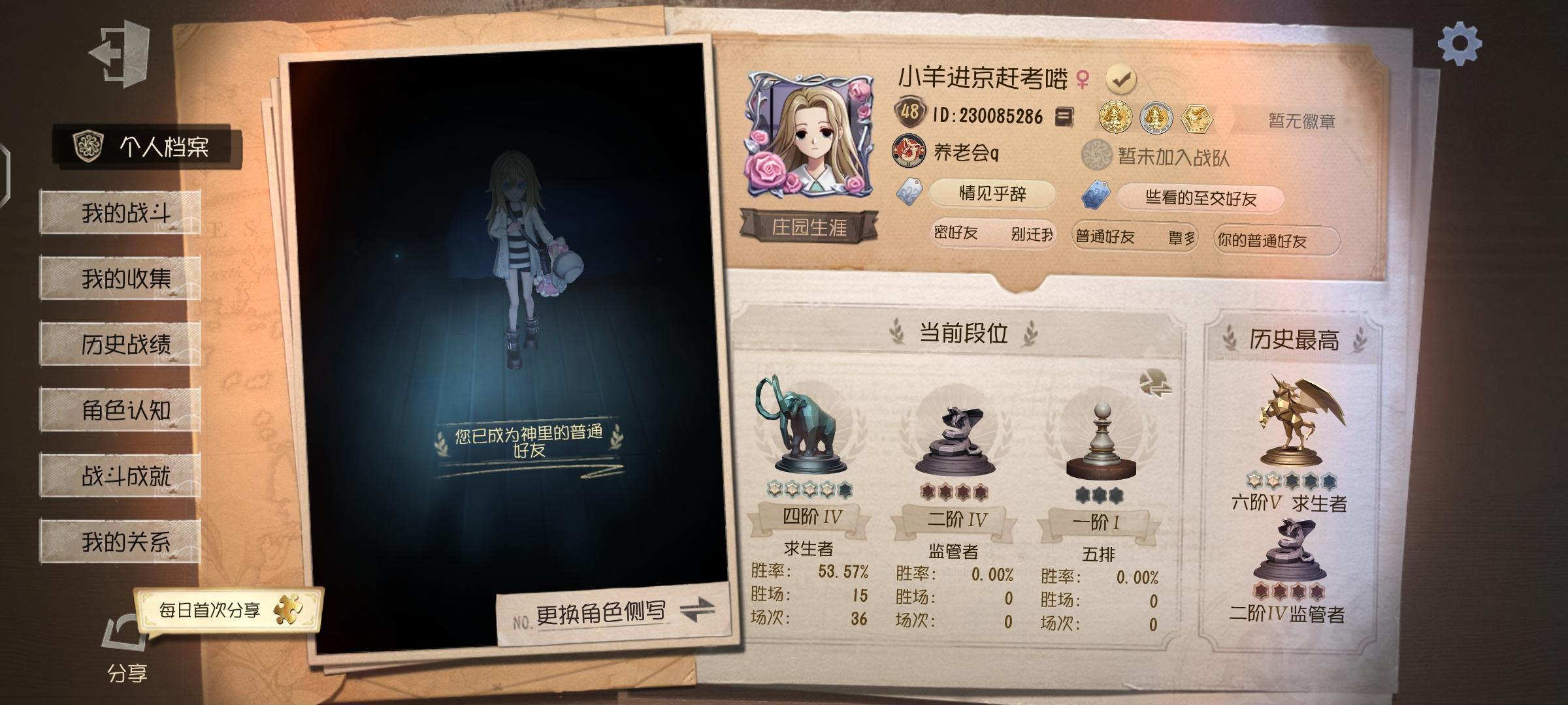 #第五人格高考前只有月假和寒假可以打 vq都🉑. 没时间打排位所以段位比较低.娱乐至上 我玩的比较杂太无聊了朋友都不玩第五.