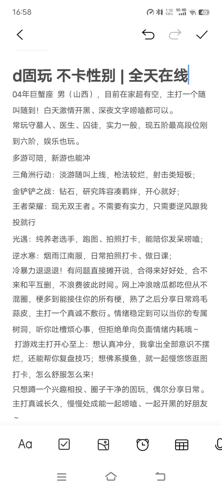 女大,喜欢打匹配,排位打的少,情绪稳定不压力不在意失败秒倒因为我也不是很厉害,主玩记者园丁,其他角色也玩儿一点,不卡麦,我一般晚上下午玩儿,还得看作息,嗯其他还没想好